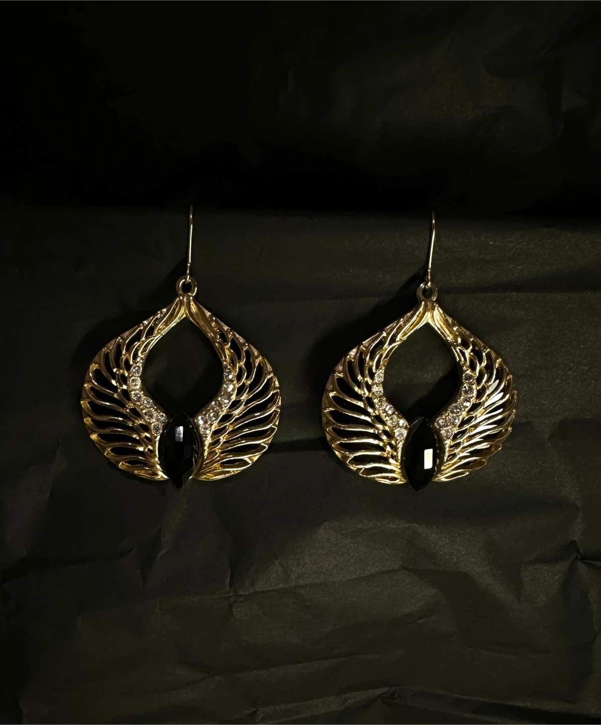 Selling a pair of gold-tone earrings with a unique design. They feature a teardrop shape with intricate detailing and black accents, adding a touch of elegance to any outfit. Perfect for dressing up or adding a bit of flair to your everyday look!