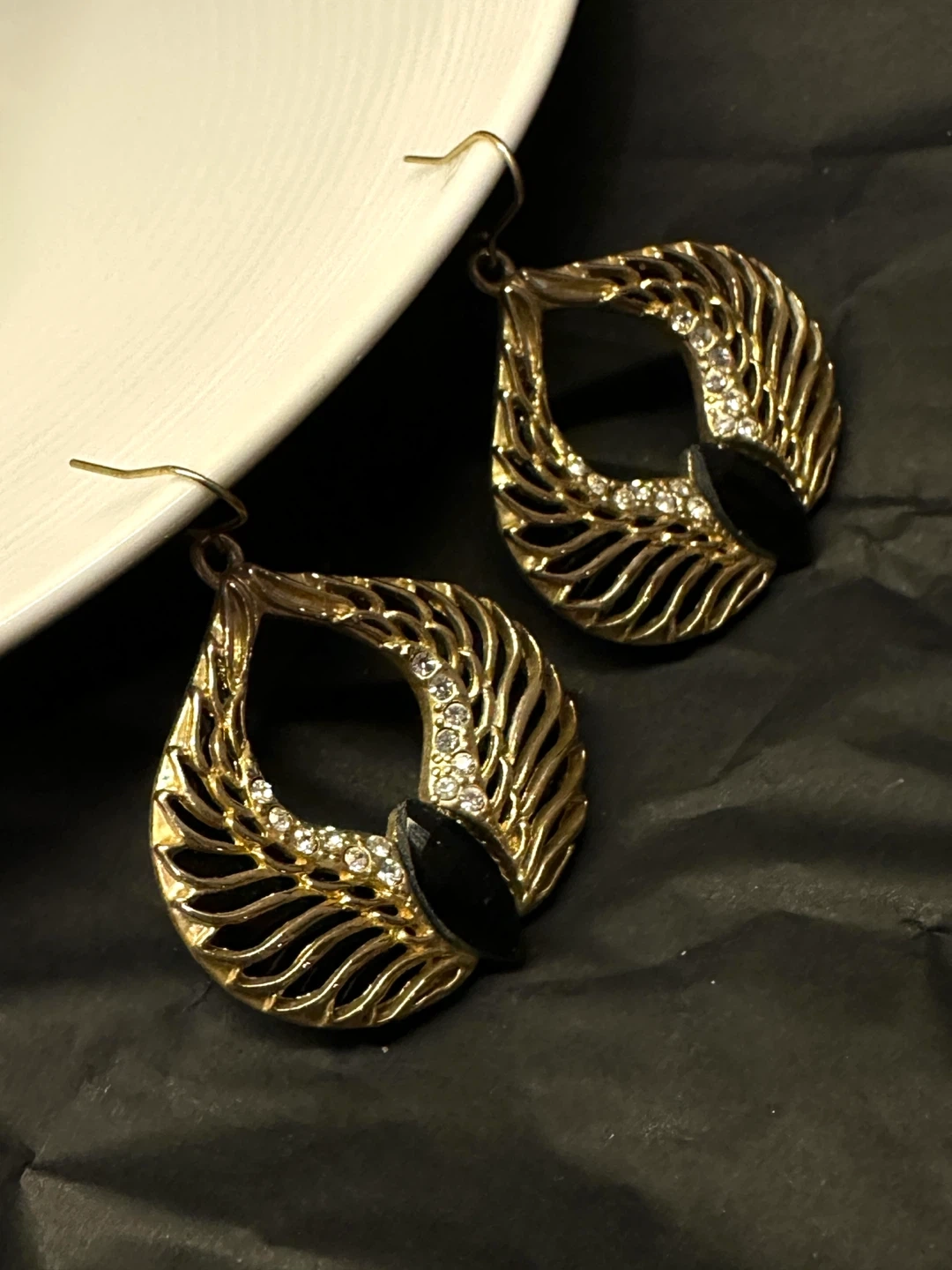 Selling a pair of gold-tone earrings with a unique design. They feature a teardrop shape with intricate detailing and black accents, adding a touch of elegance to any outfit. Perfect for dressing up or adding a bit of flair to your everyday look!