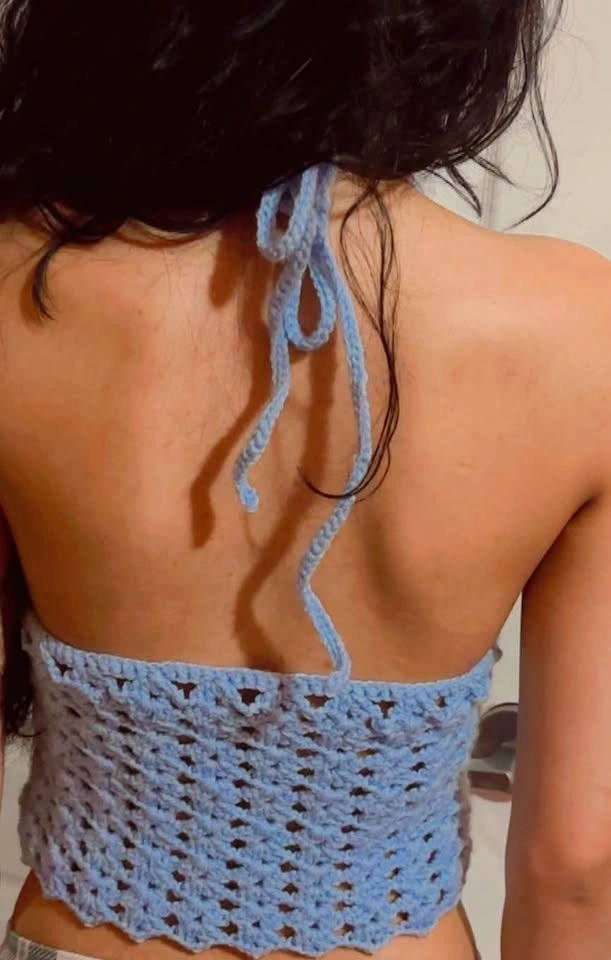 Handmade crochet halter top in soft light blue color. Designed with adjustable ties at the front and behind the neck for a secure, customizable fit. Lightweight and breathable with a flattering shape that’s easy to wear on warm days.