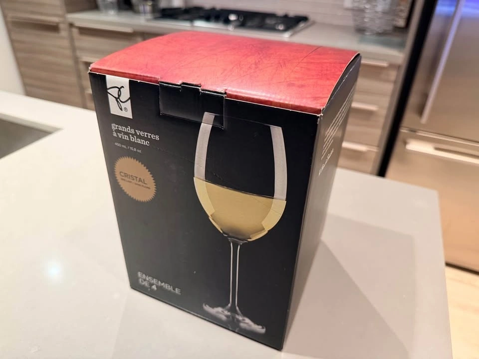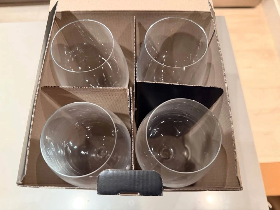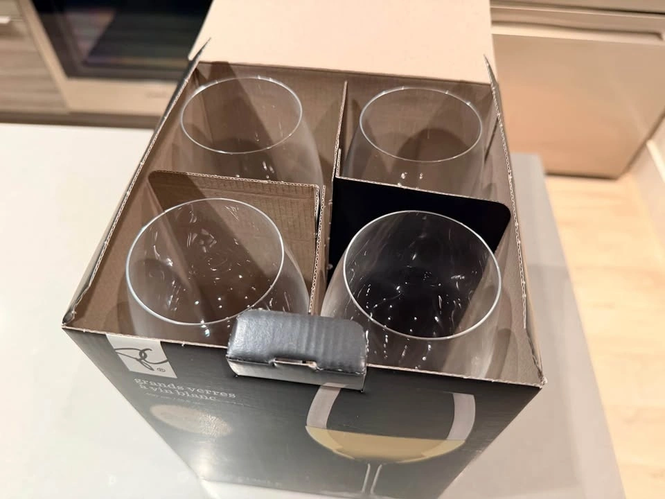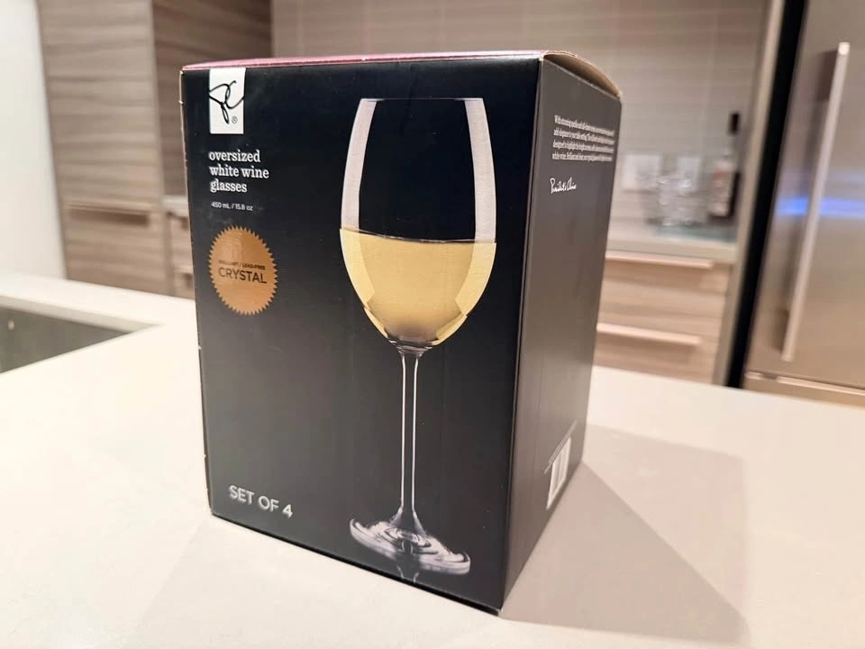 Set of 4 oversized white wine glasses. Brand new and never used, still in the original box with packaging.