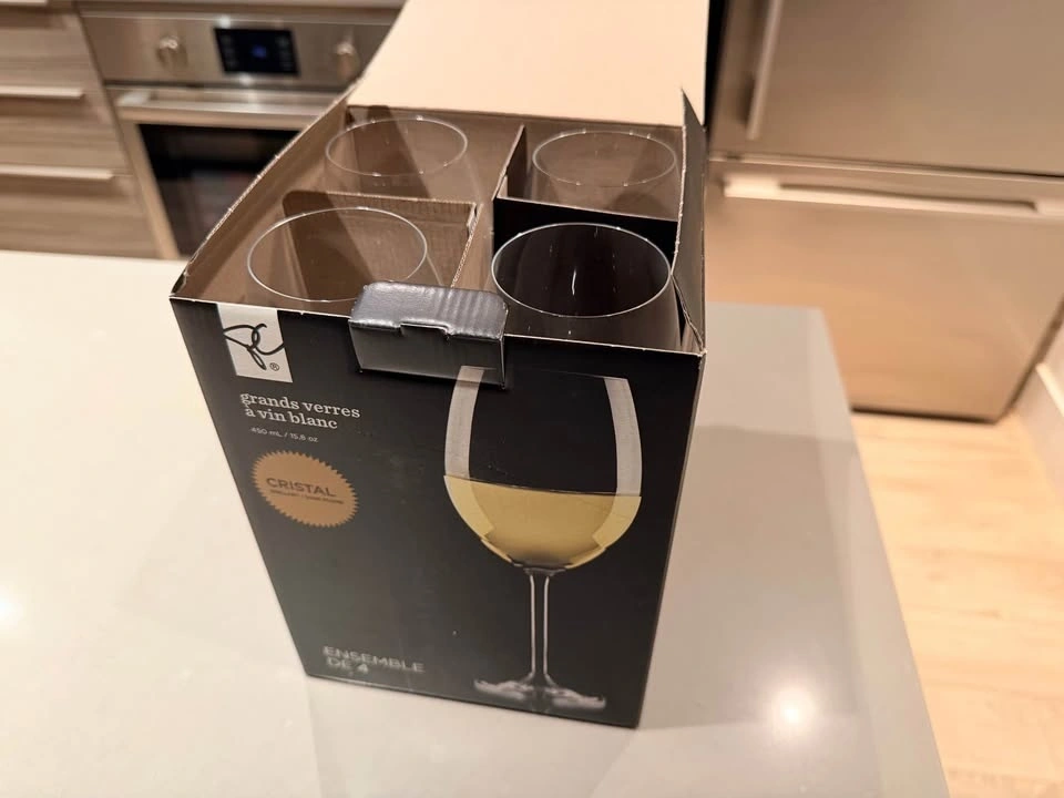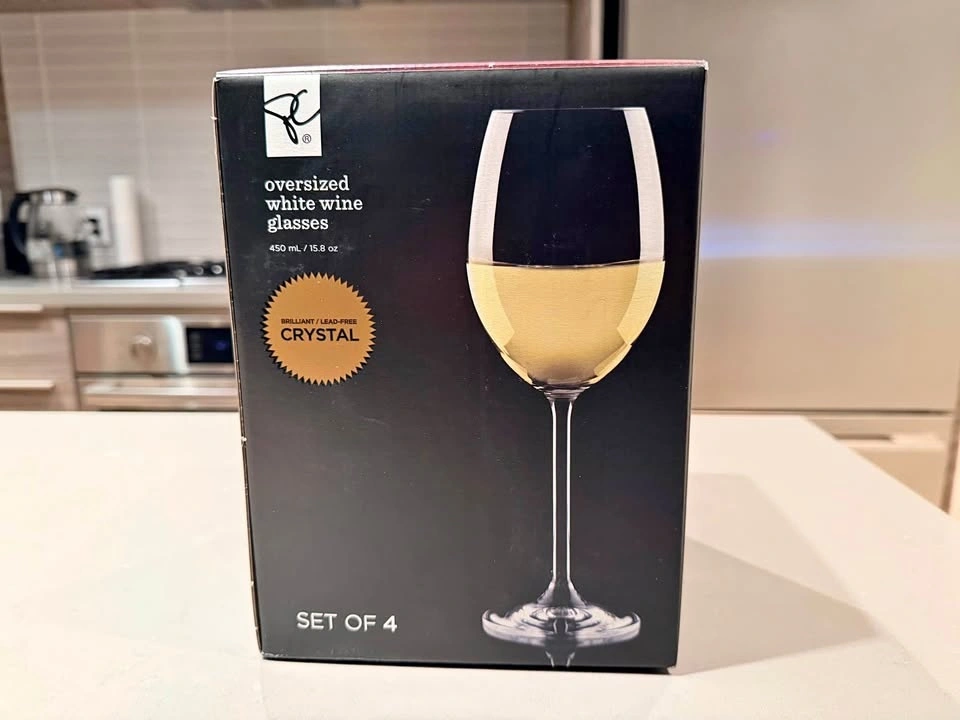 Set of 4 oversized white wine glasses. Brand new and never used, still in the original box with packaging.