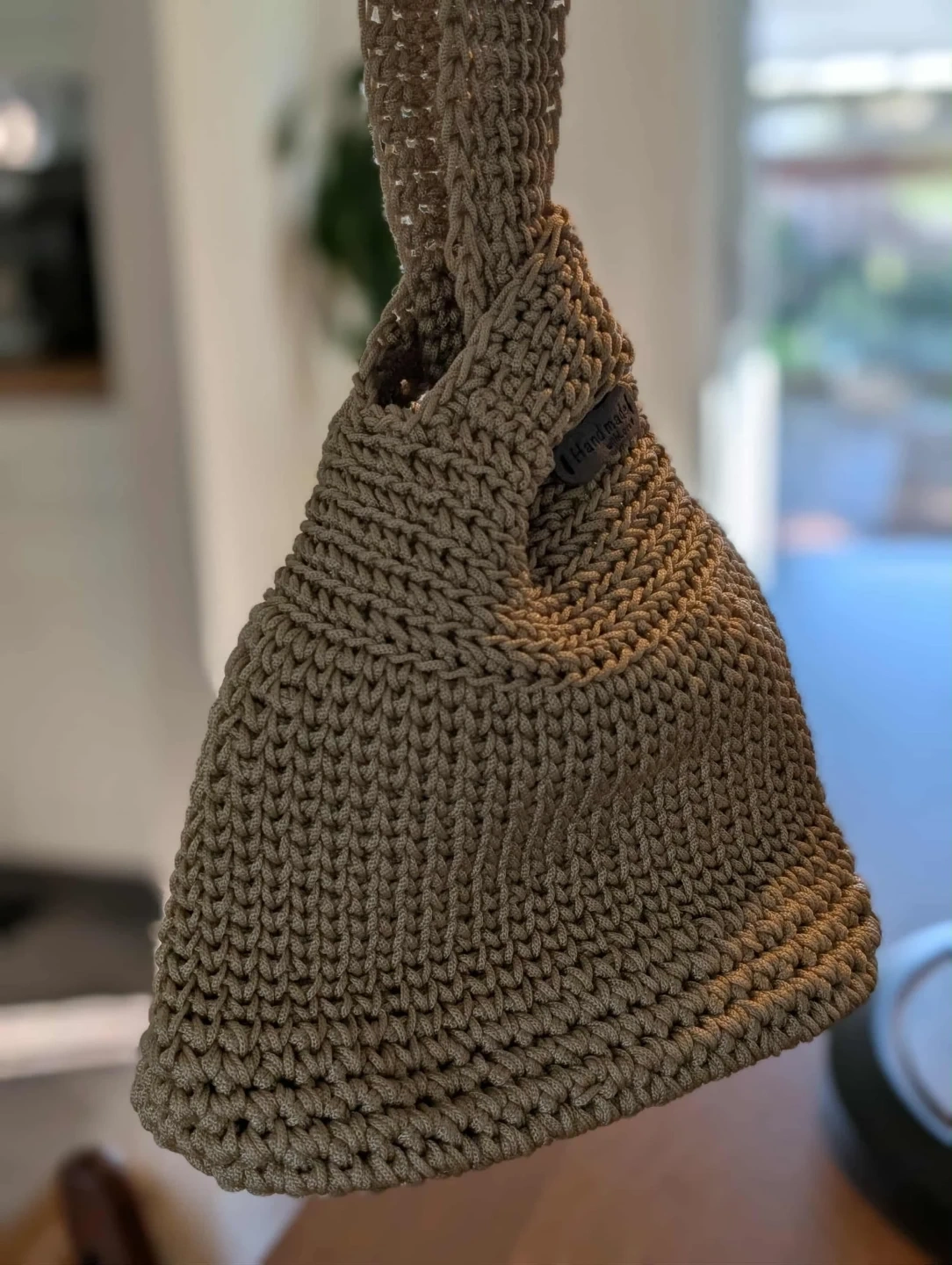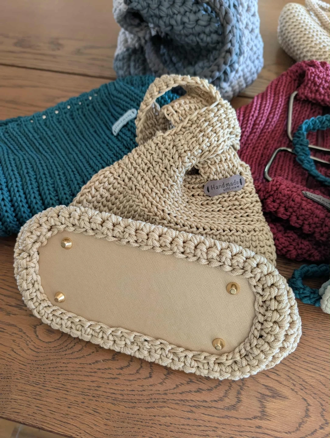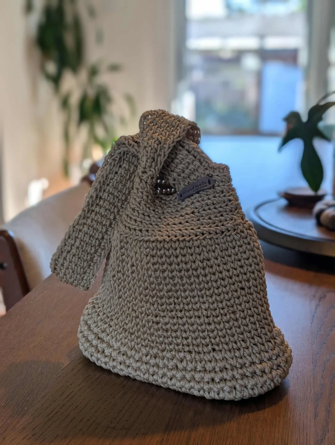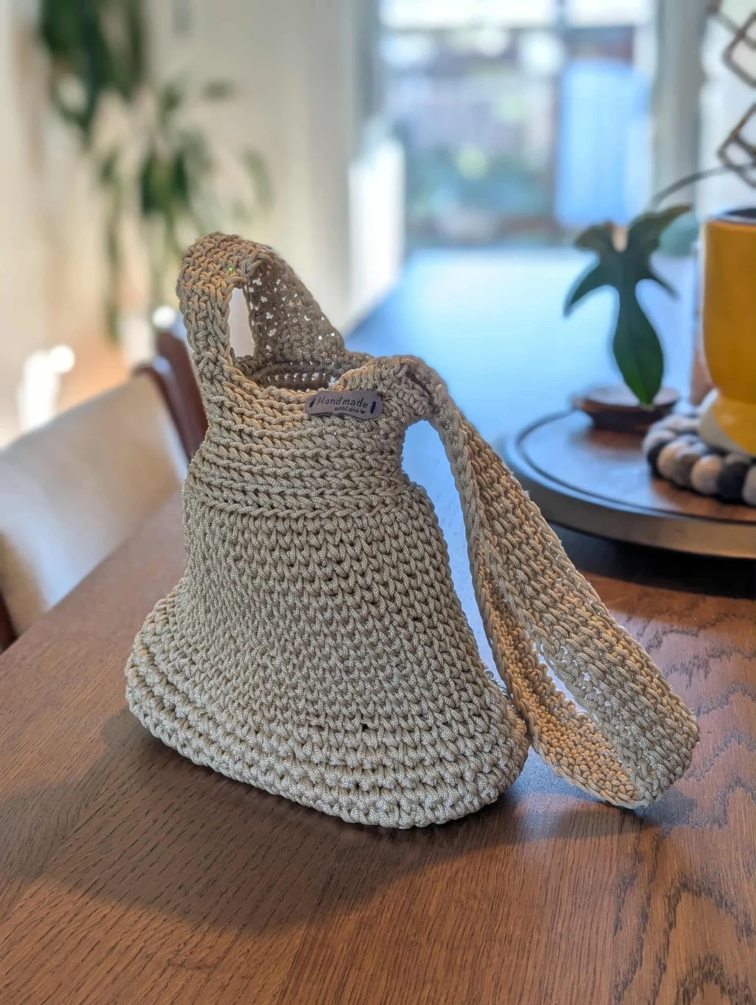 Check out this cute handmade crochet bag! It's a neutral beige colour and has a unique design. Perfect for adding a touch of handmade charm to your outfit!