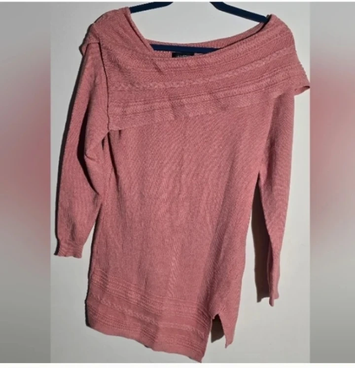 A lovely pink off-the-shoulder sweater! It's in great condition and ready to wear. The colour is a beautiful soft pink, perfect for adding a touch of warmth to your wardrobe. It's a stylish and comfortable piece!
