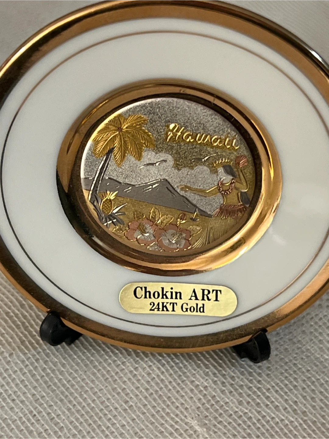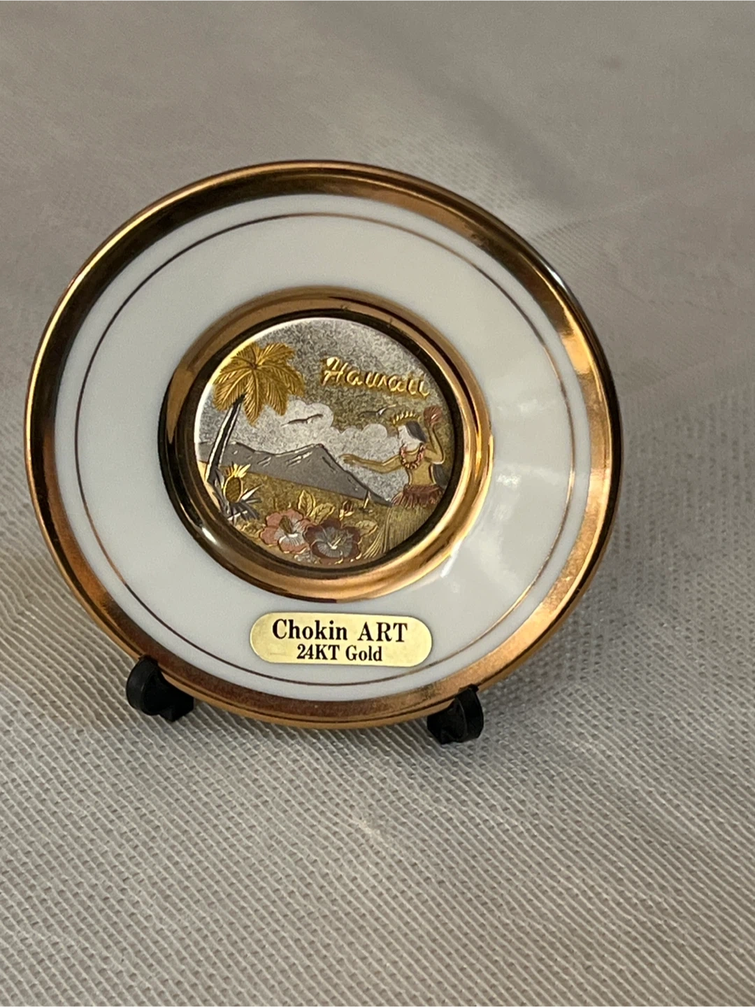 Selling a lovely Chokin Art plate featuring a Hawaii design. It's decorated with 24KT gold. The metal engravings are from Japan and created by the ancient art of Chokin. These engravings were originally created to decorate the armament of the SAMURAI warriors