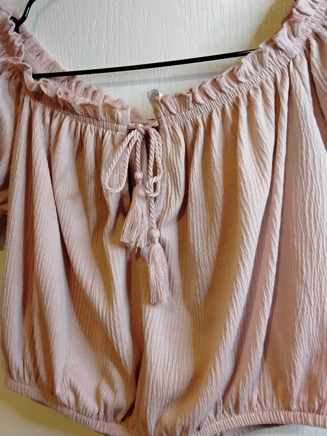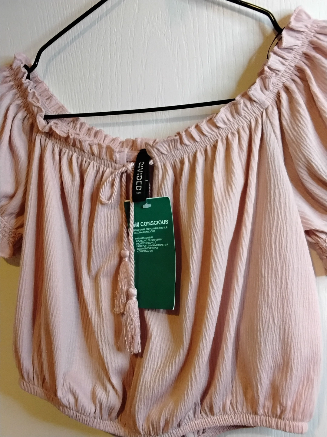 Here's a cute H&M Conscious Cropped blouse in a lovely shade of pink! It's a size Small and features a stylish design with tassel details. Perfect for adding a touch of charm to your wardrobe!