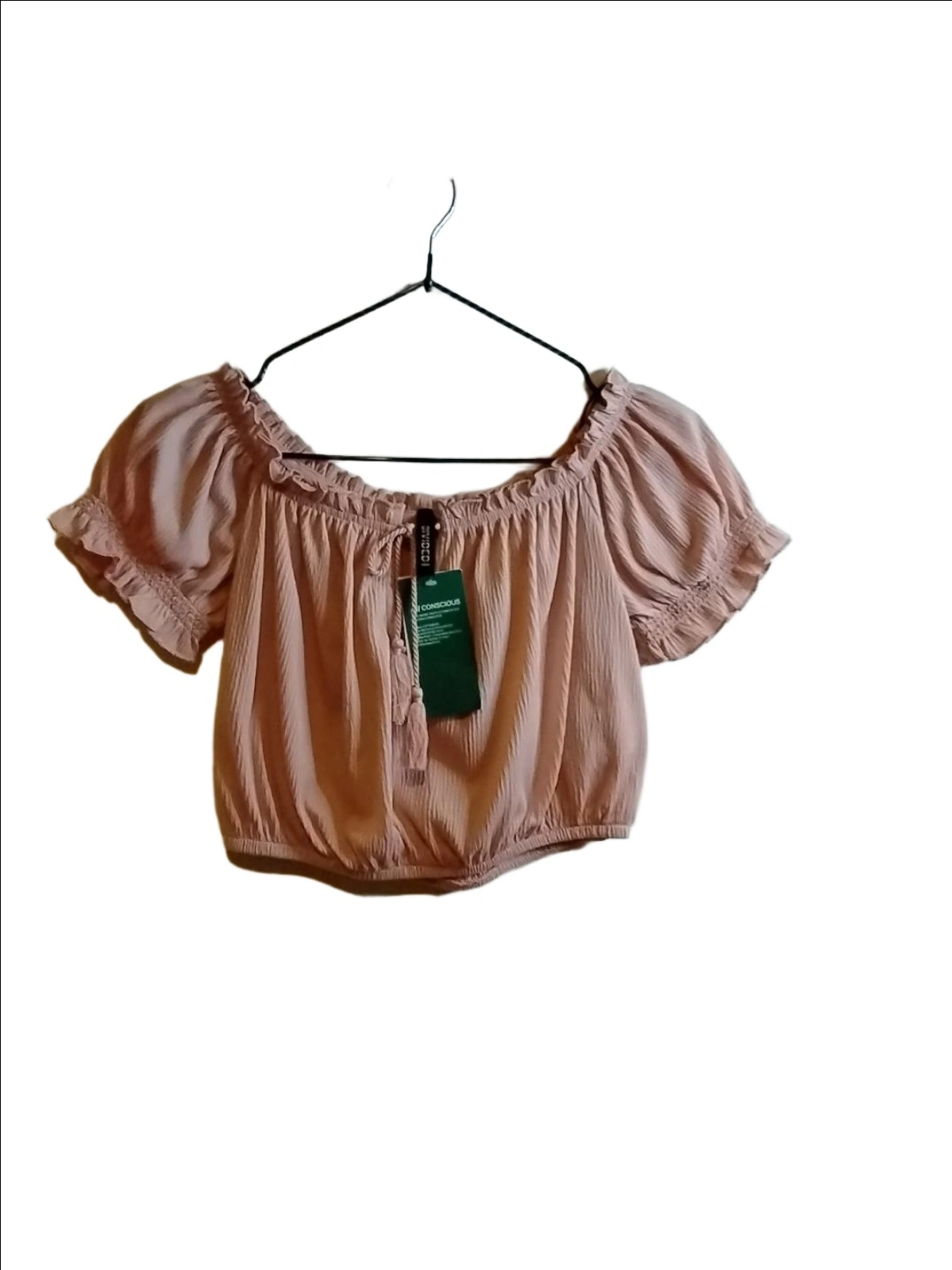 Here's a cute H&M Conscious Cropped blouse in a lovely shade of pink! It's a size Small and features a stylish design with tassel details. Perfect for adding a touch of charm to your wardrobe!