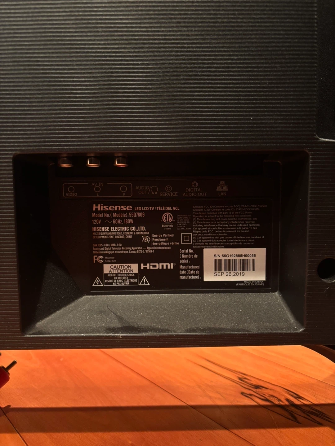 Selling a Hisense 55 inch LED LCD TV. The model number is 55U6070G9. It's a smart TV with 4K HDR. There are multiple HDMI and USB ports.
