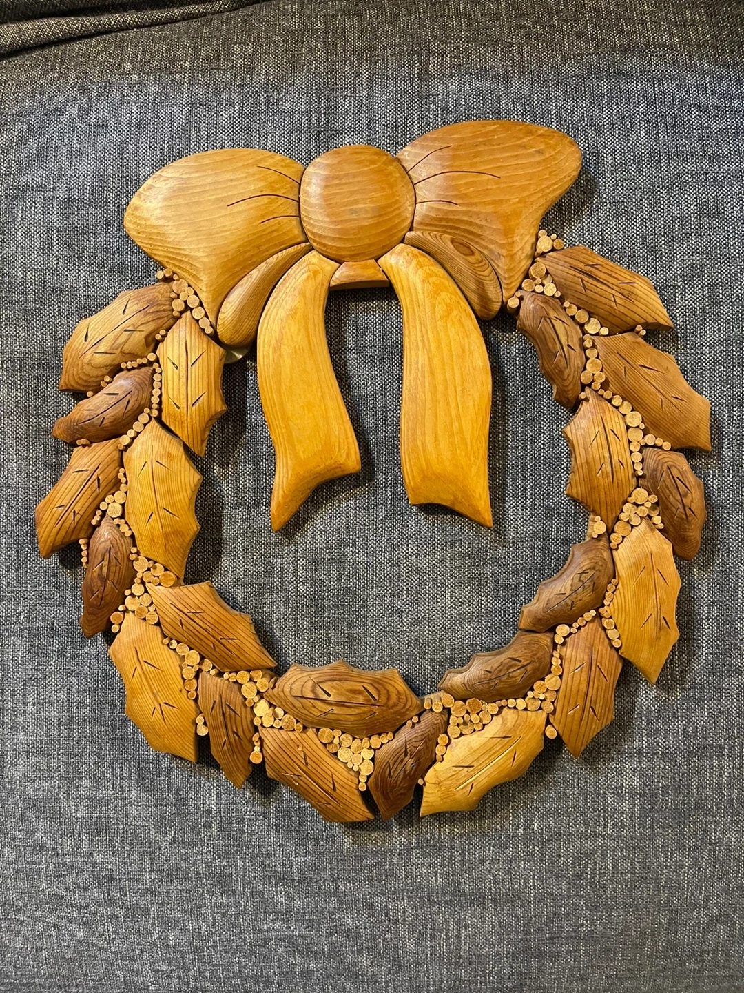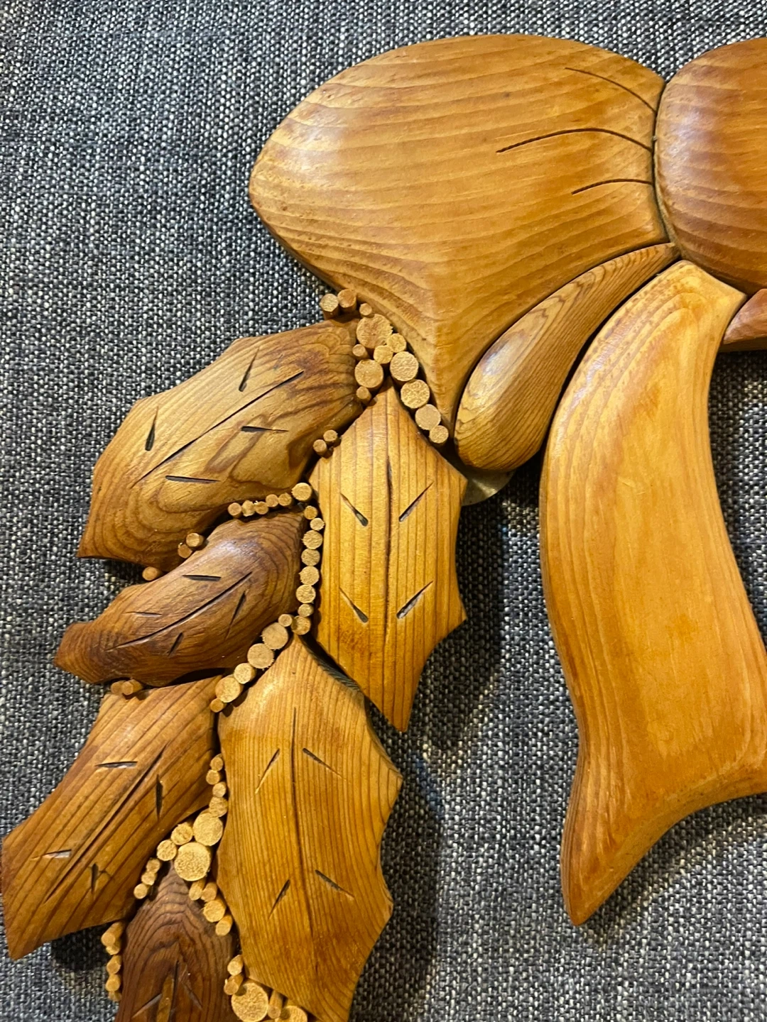 The wreath is made of wood and features a lovely bow at the top. It measures approximately 18 inches in diameter.