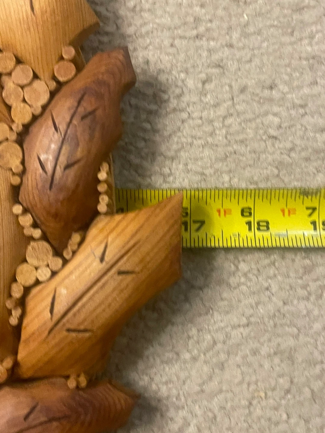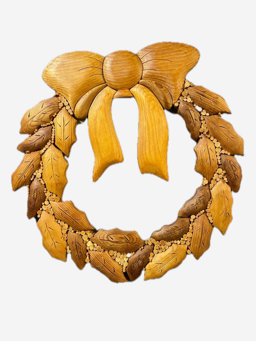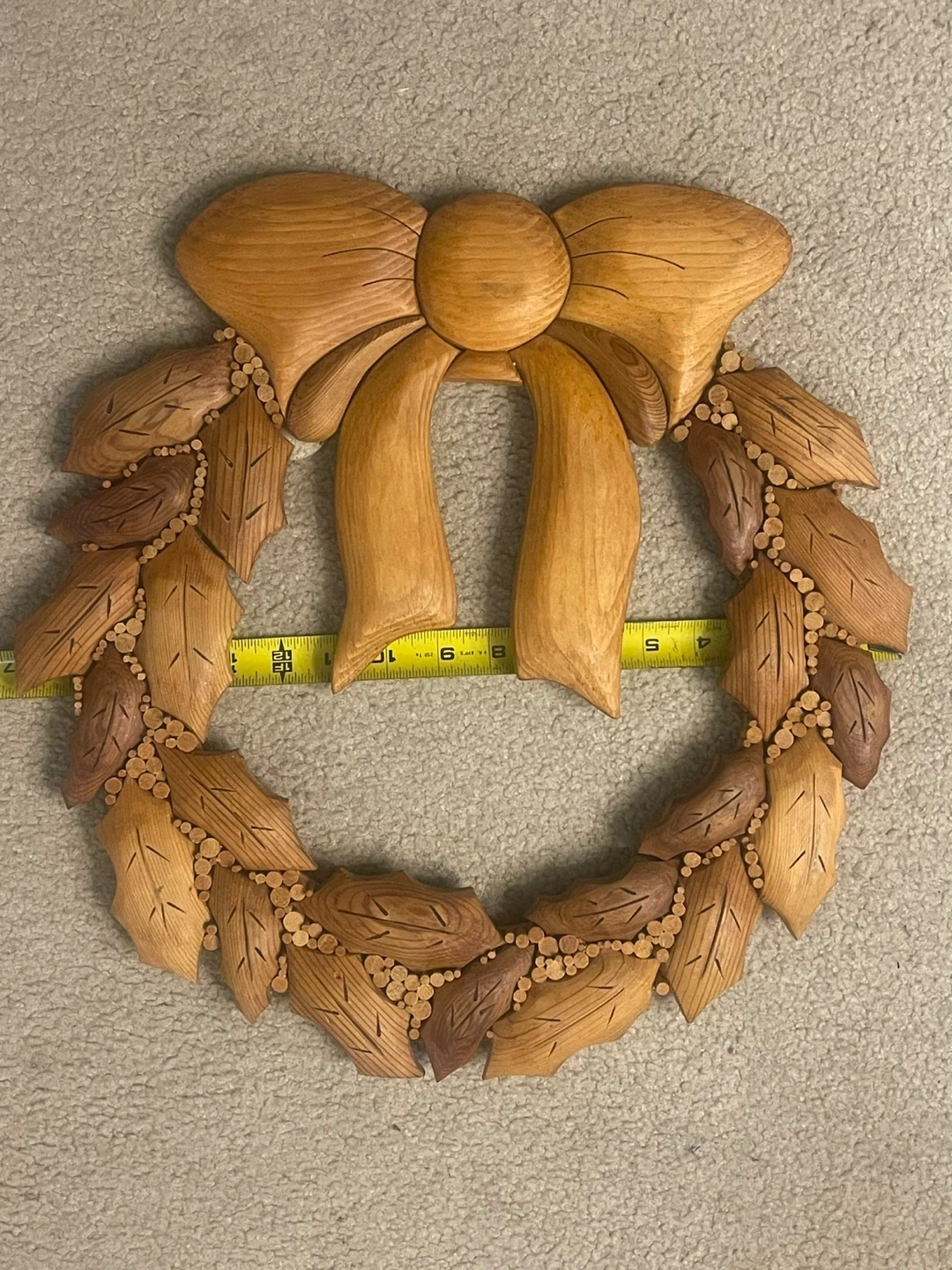 The wreath is made of wood and features a lovely bow at the top. It measures approximately 18 inches in diameter.