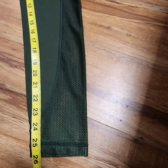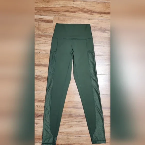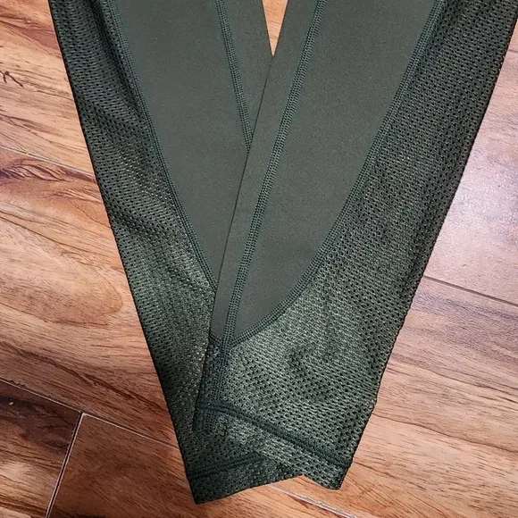 Selling a pair of OFFLINE by Aerie leggings in olive green! They're a size small and feature a stylish mesh design on the lower leg. Perfect for workouts or just lounging around