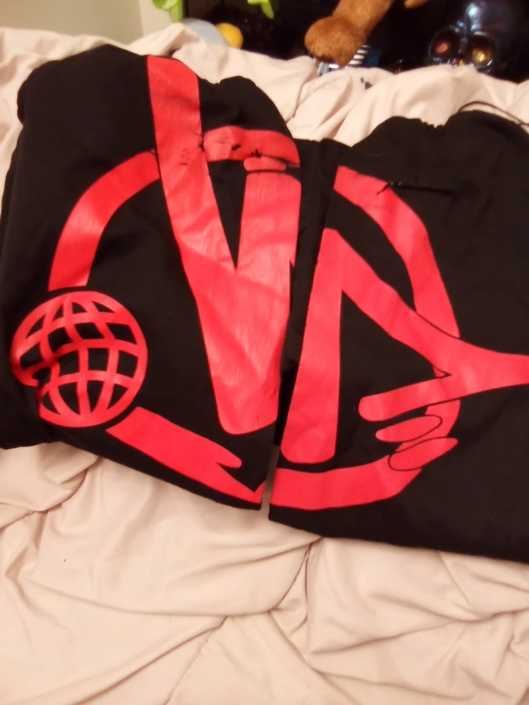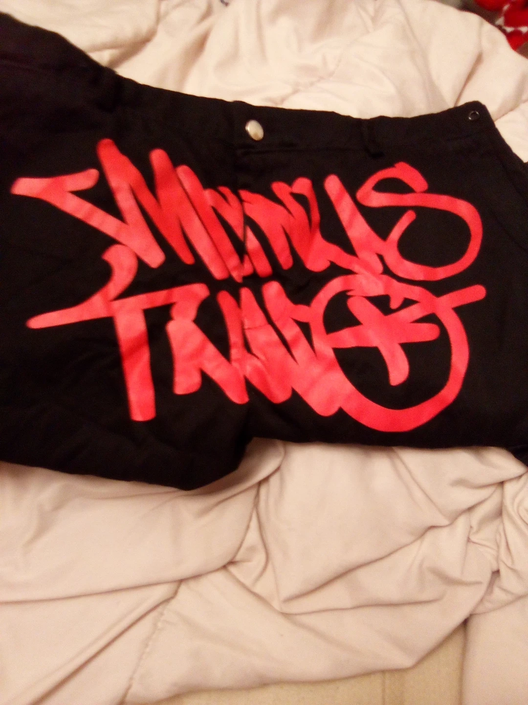 Selling a pair of Minus Two black pants. They feature a red graphic design. Great for adding a unique touch to your wardrobe! Plus it's extra baggy.