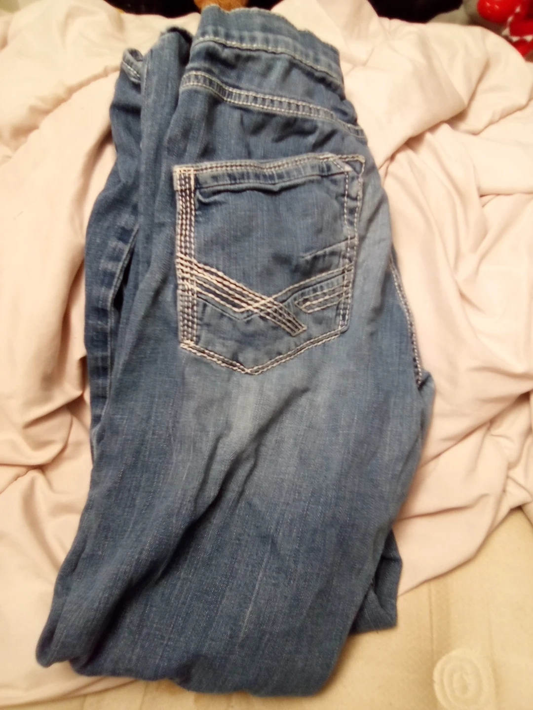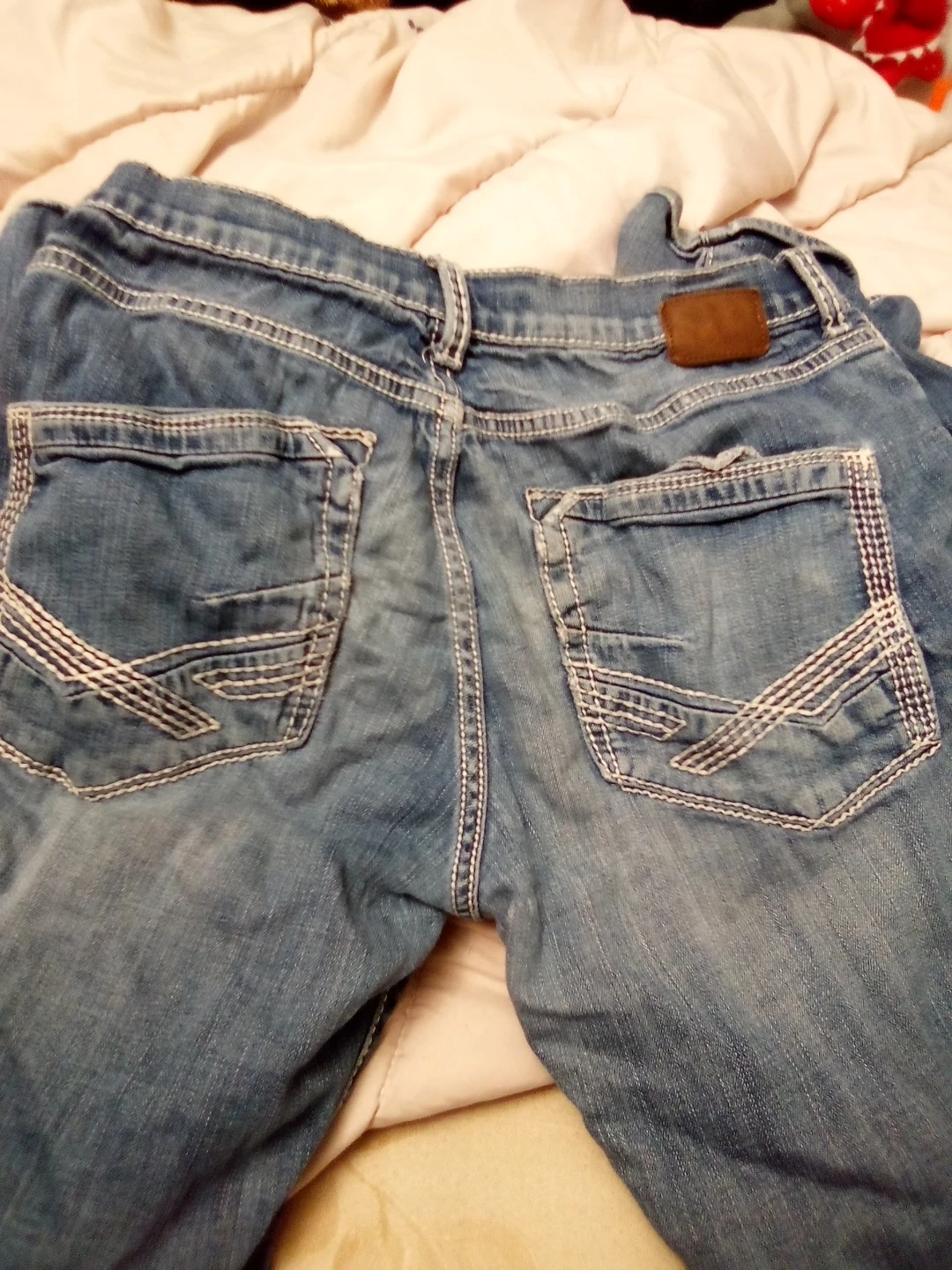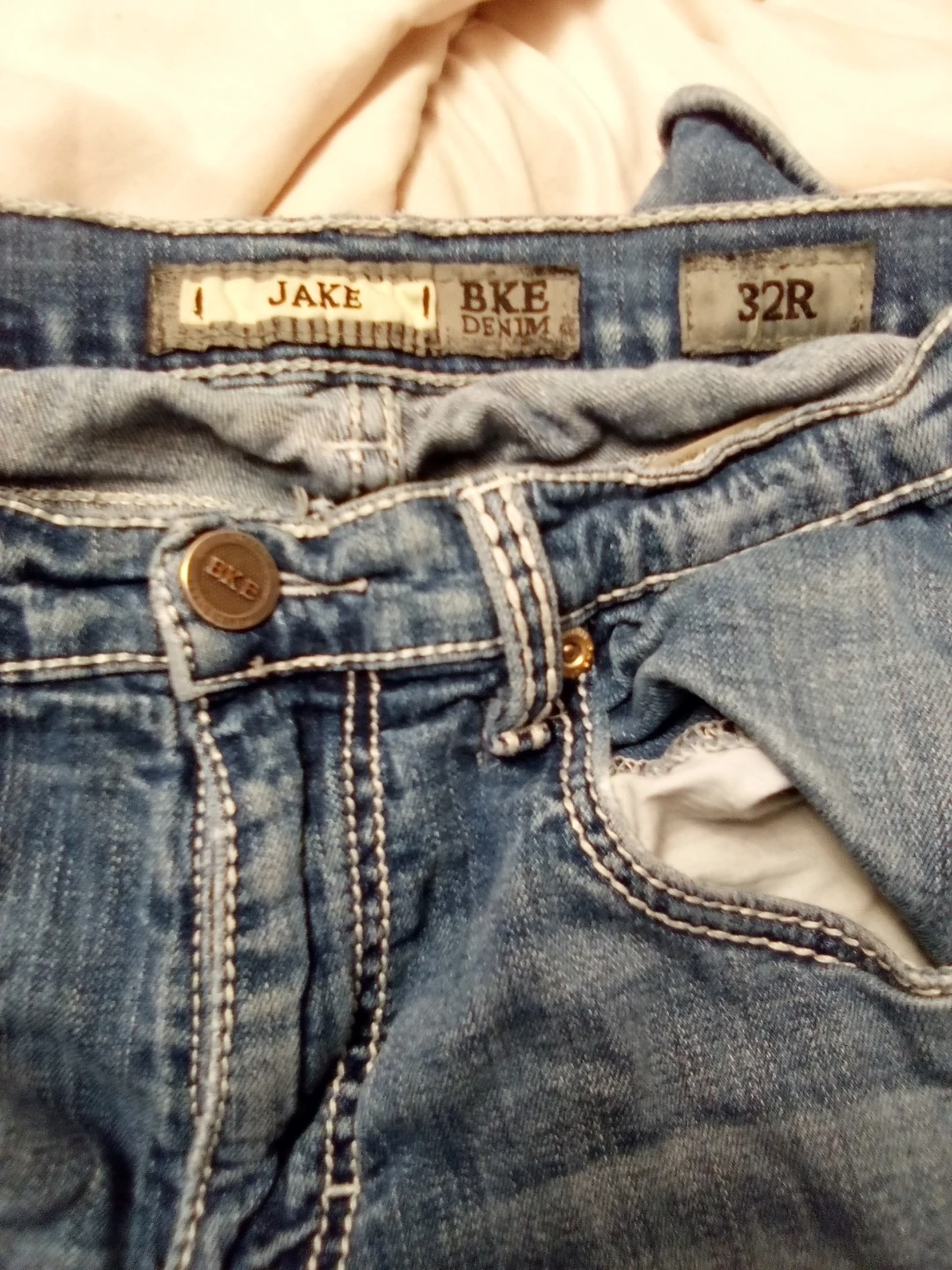 Selling a pair of BKE Jake denim jeans in size 32R. They're in good condition and have a classic look with detailed stitching on the pockets. Perfect for everyday wear!