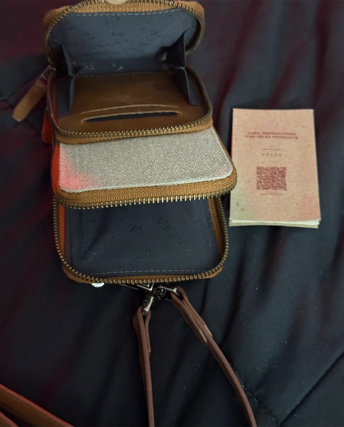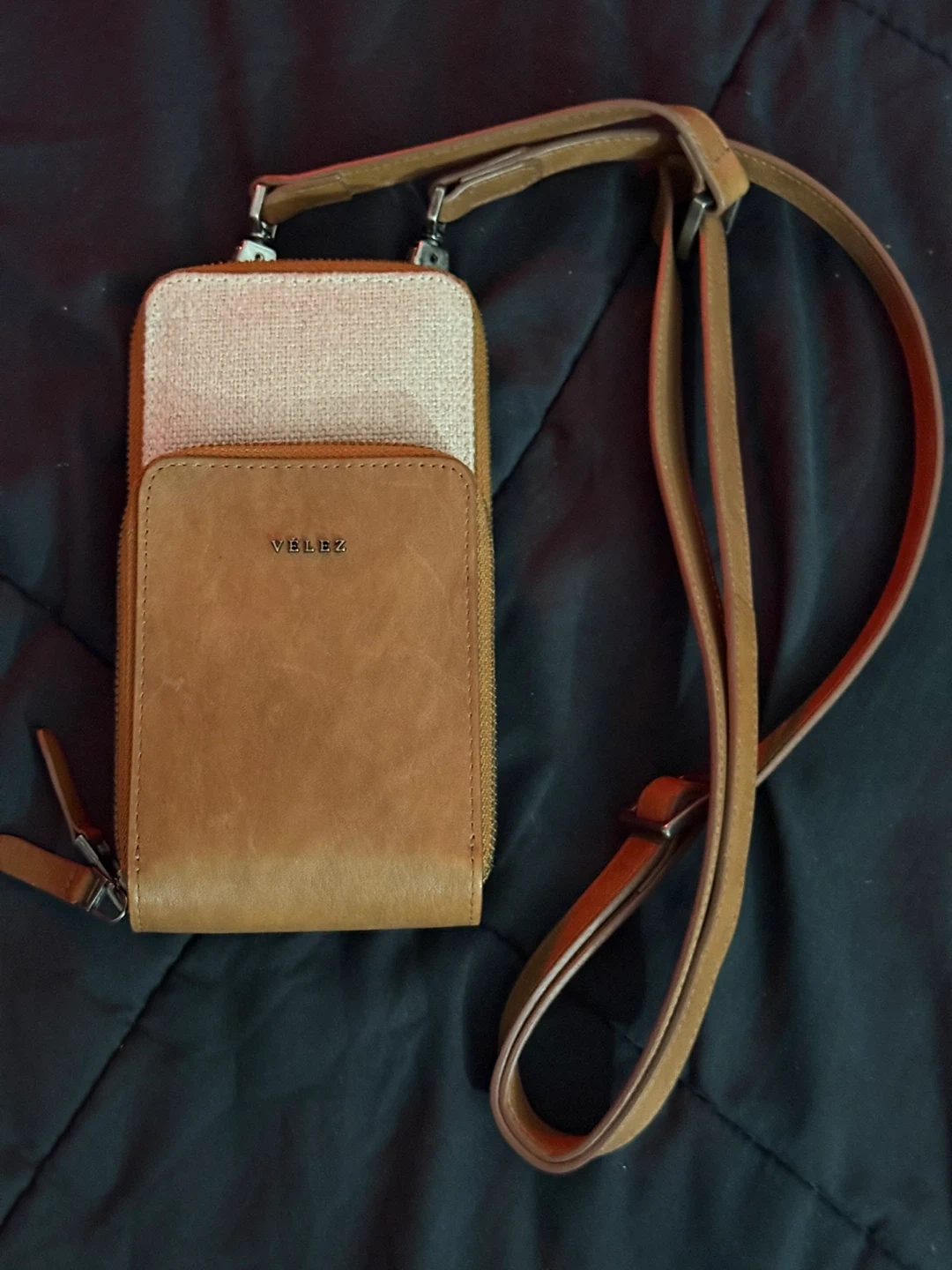 Velez leather crossbody phone bag canvas Miel. The bag has a stylish design and is made from high-quality leather, ensuring durability and a classic look