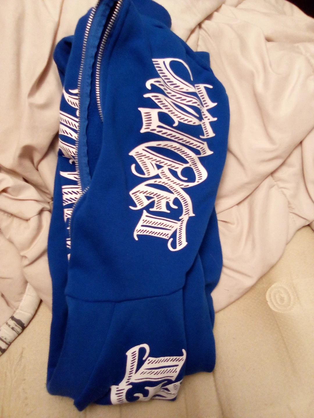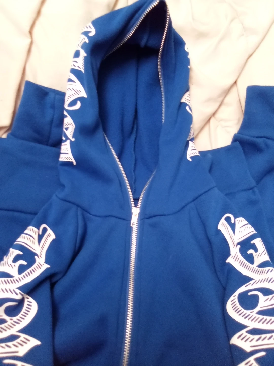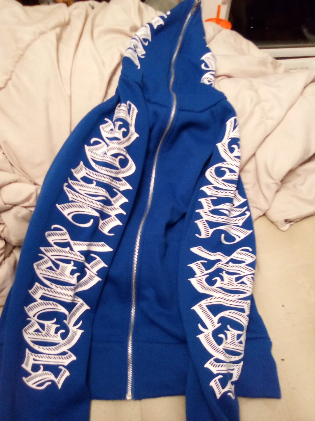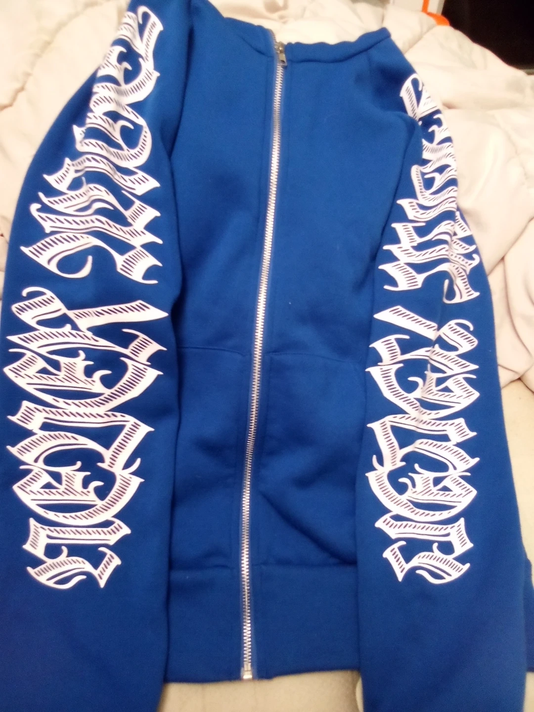 Selling a blue zip-up hoodie. It features a design on the sleeves and looks to be in good condition. Great for layering or wearing on its own!