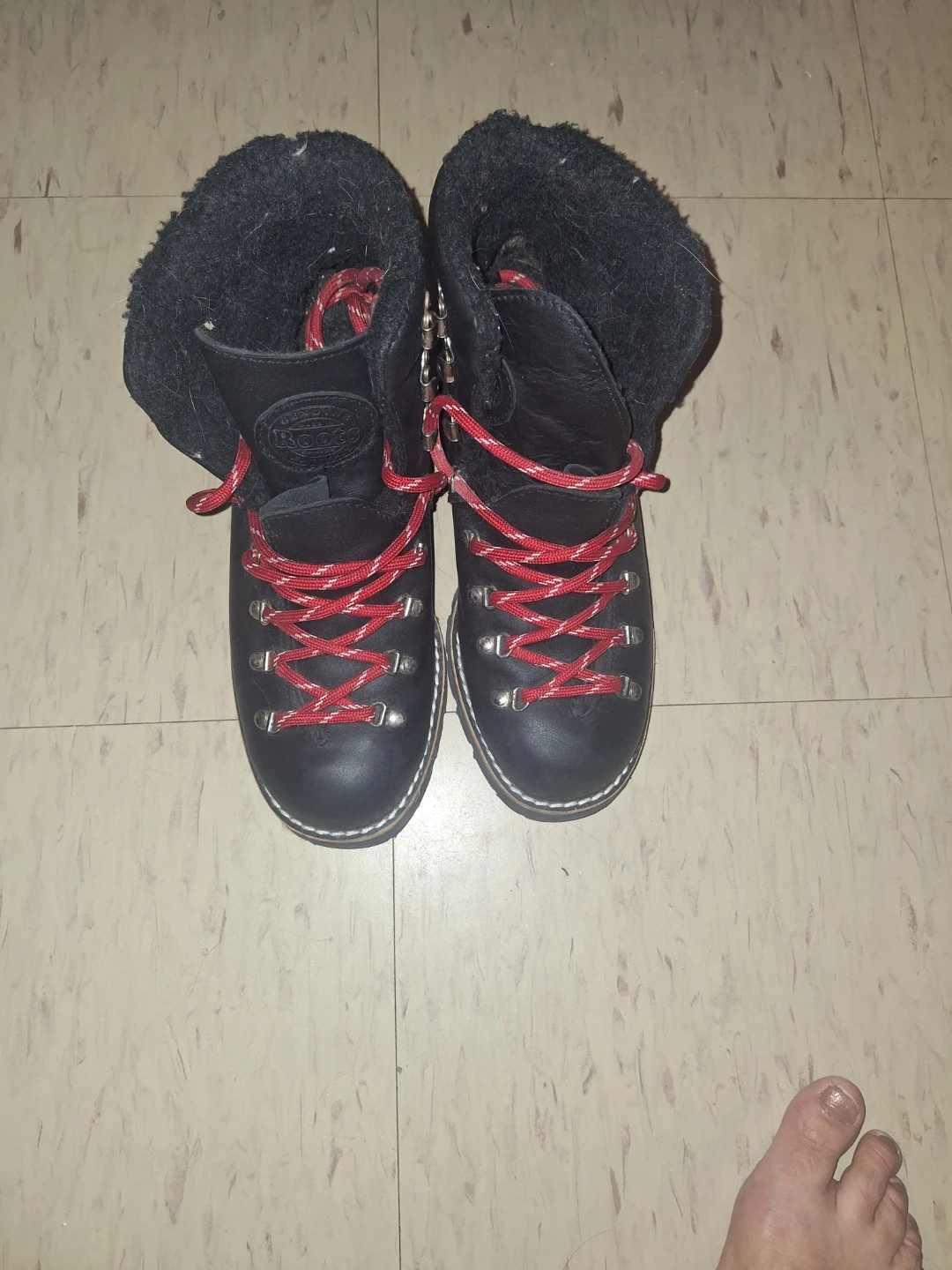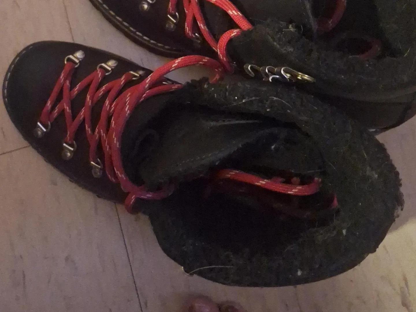 Selling a pair of Rosta hiking boots! They're black leather with red laces and have a cozy, warm lining. They've got some wear on the soles, but plenty of life left for your next adventure!