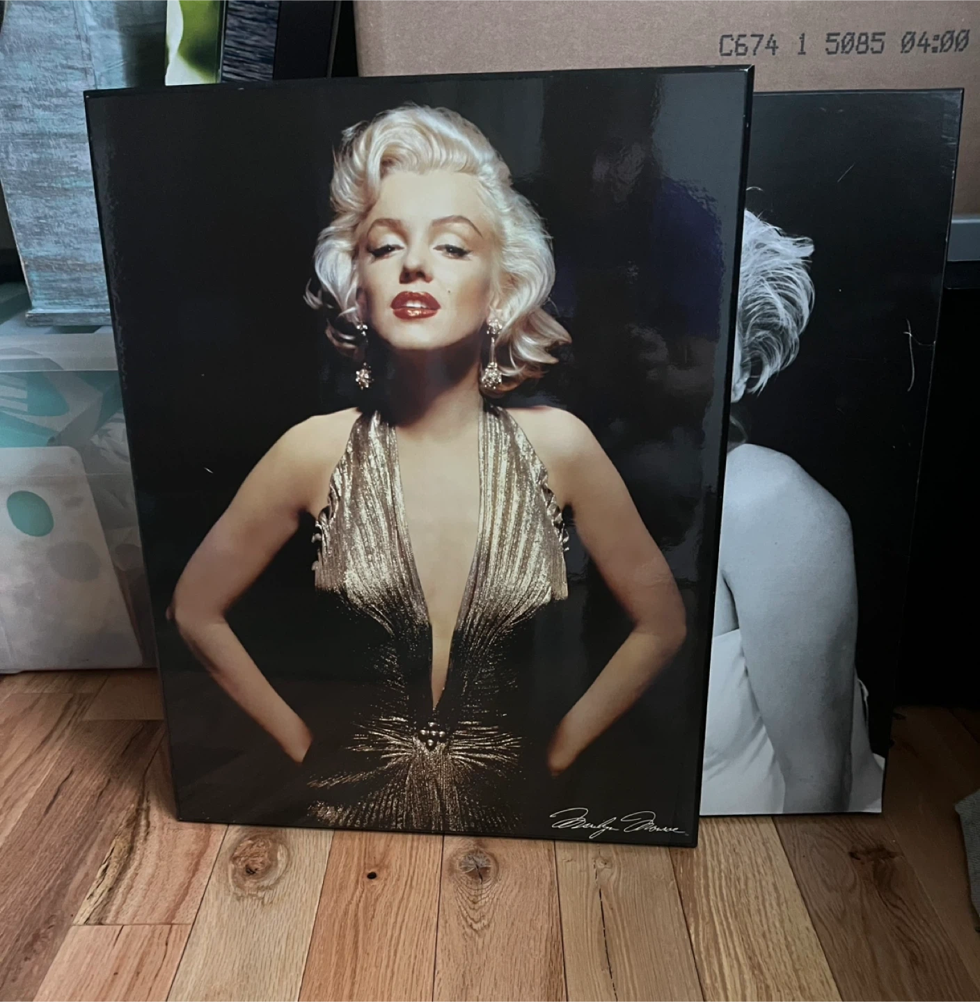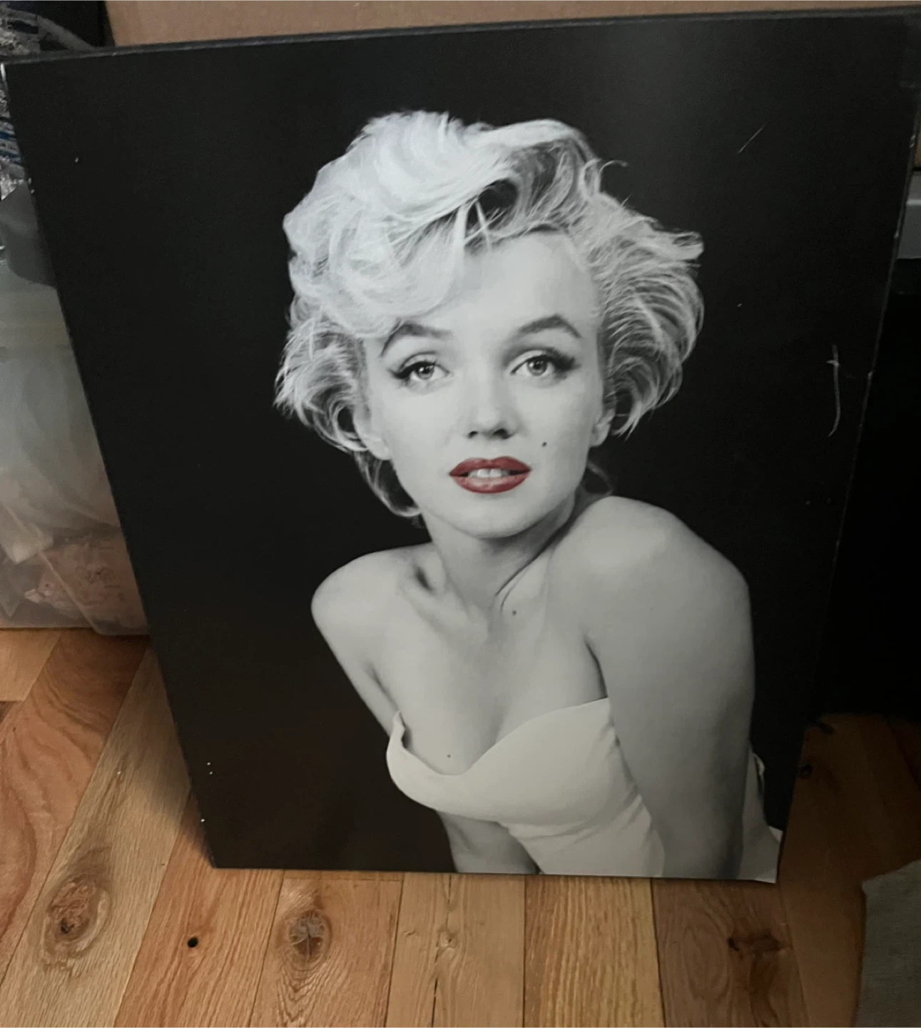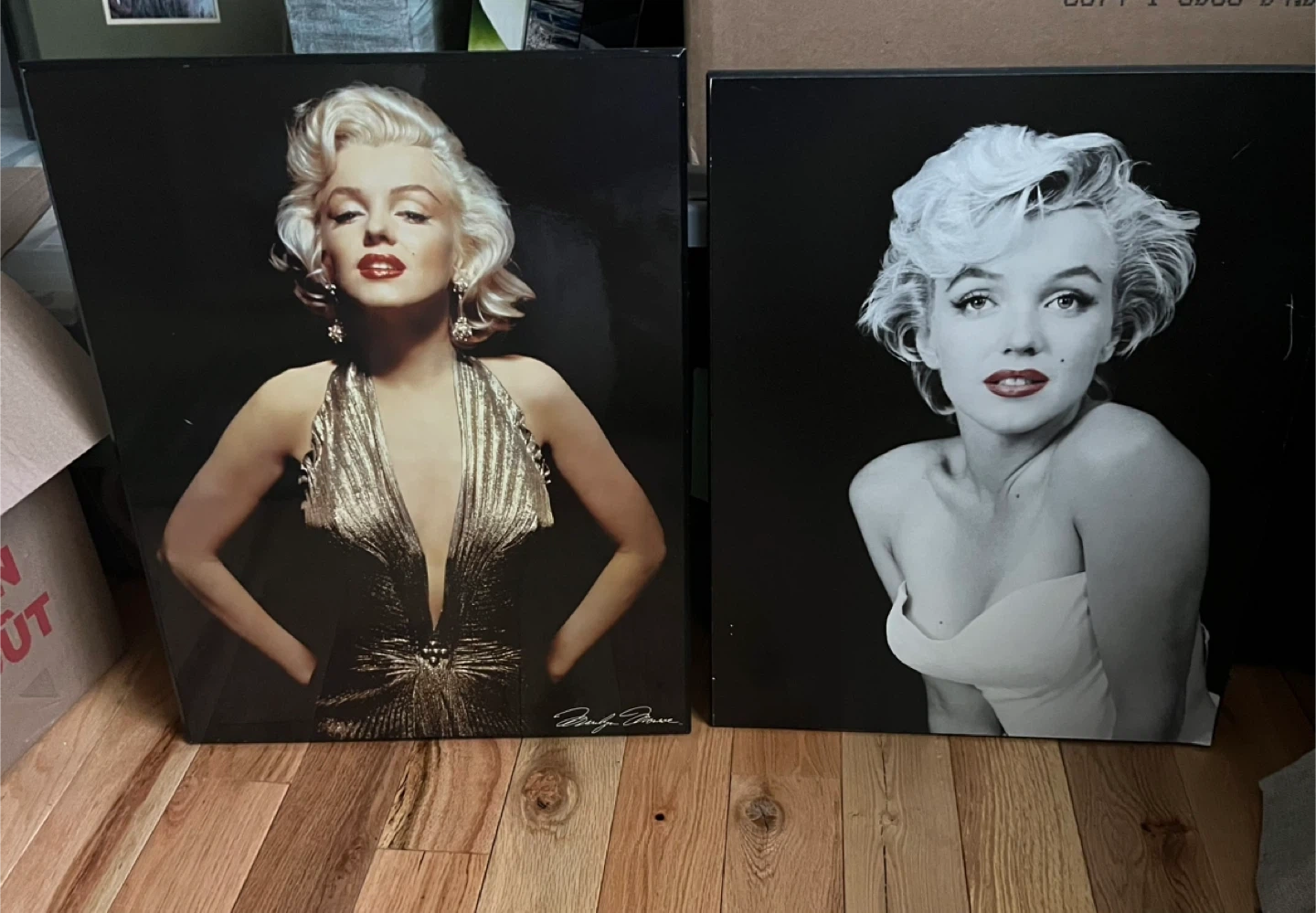 Selling two wood prints of Marilyn Monroe. One is a black and white photo and the other is a colour photo. There is some slight damage on the corners of the black and white print, as shown in the photos