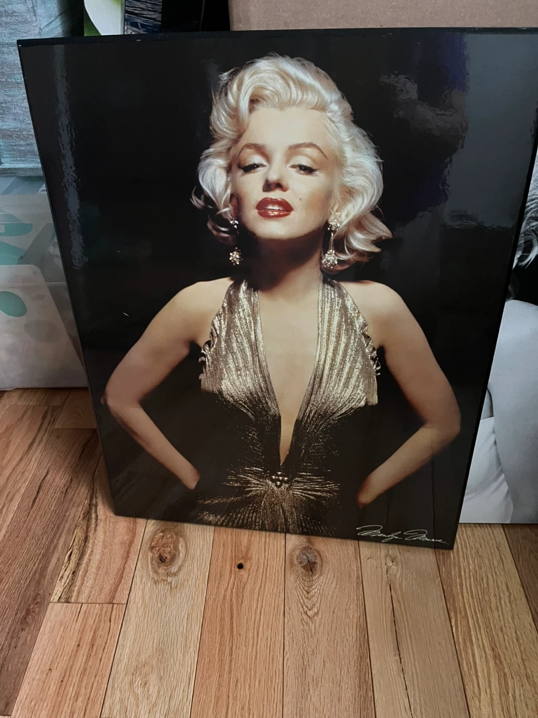 Selling two wood prints of Marilyn Monroe. One is a black and white photo and the other is a colour photo. There is some slight damage on the corners of the black and white print, as shown in the photos