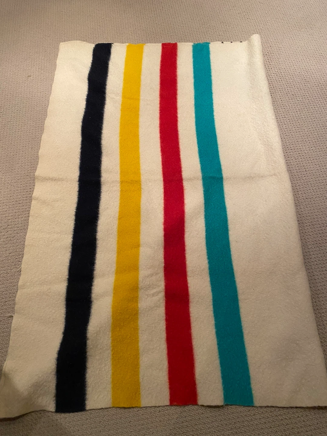 Selling a Hudson's Bay Point Blanket made of 100% wool. It features the classic stripes and is in perfect condition. The seal of quality ensures it's a durable and warm blanket, perfect for those chilly Canadian nights!