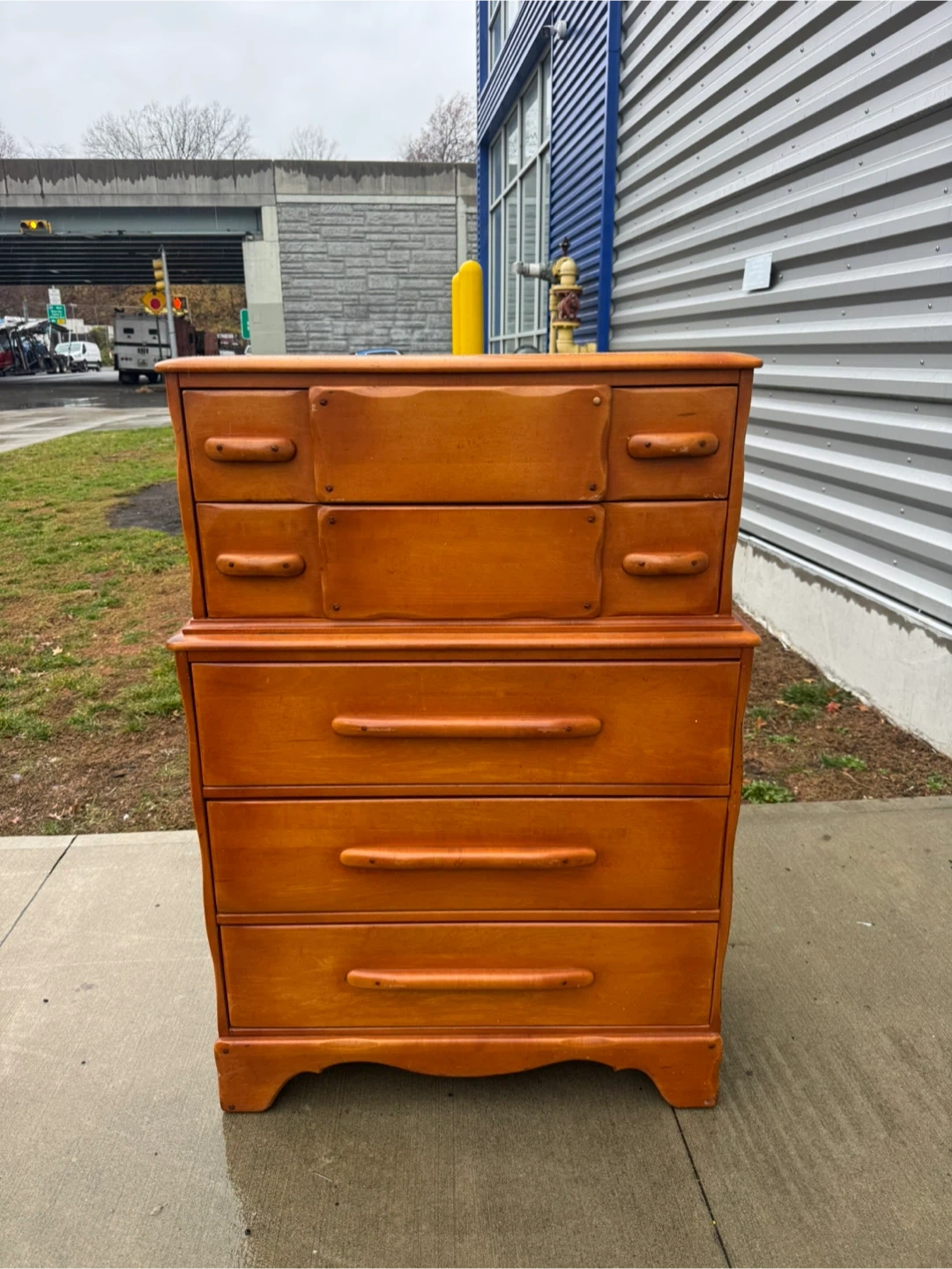 Here's a wooden dresser with a unique design. It has multiple drawers for ample storage space. The dresser is in good condition and ready to use!