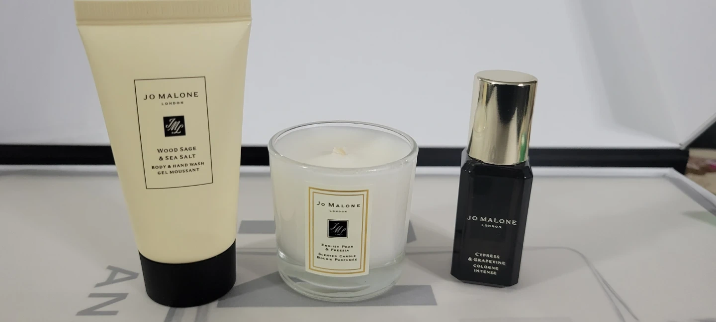 Jo Malone London set features three luxurious travel-size items, perfect for sampling the brand's iconic scents or as a sophisticated gift. The set includes a body and hand wash, a scented candle, and a cologne intense.
