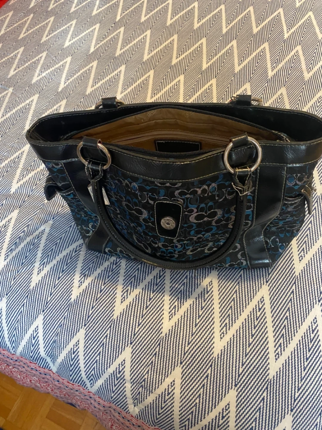 Selling a cute Coach handbag featuring the signature 'C' print in black and blue tones. It's a stylish and practical bag for everyday use! The bag has a buckle detail on the front and comfortable handles for easy carrying . Great Christmas gift for someone.