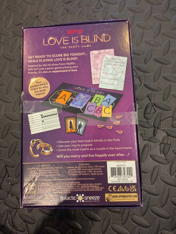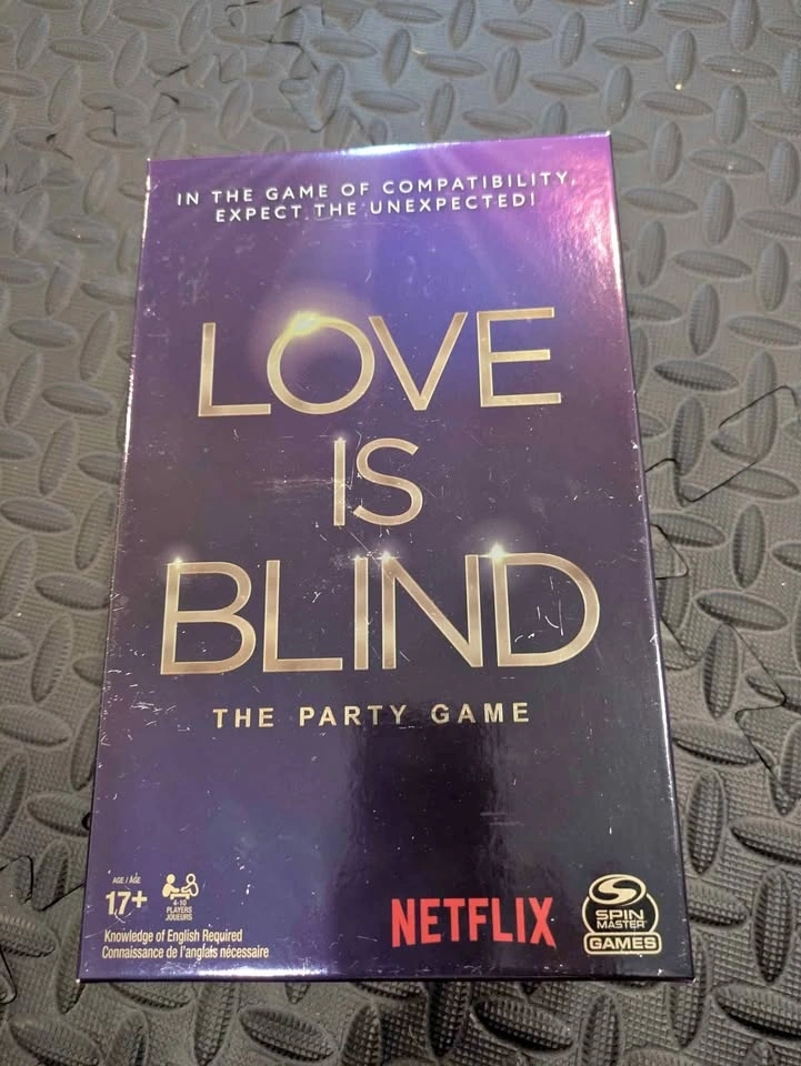 Love is Blind party game. Brand new. Never played. The box is a bit bent due to storage, only opened to take pictures. See pictures for the details of the game.