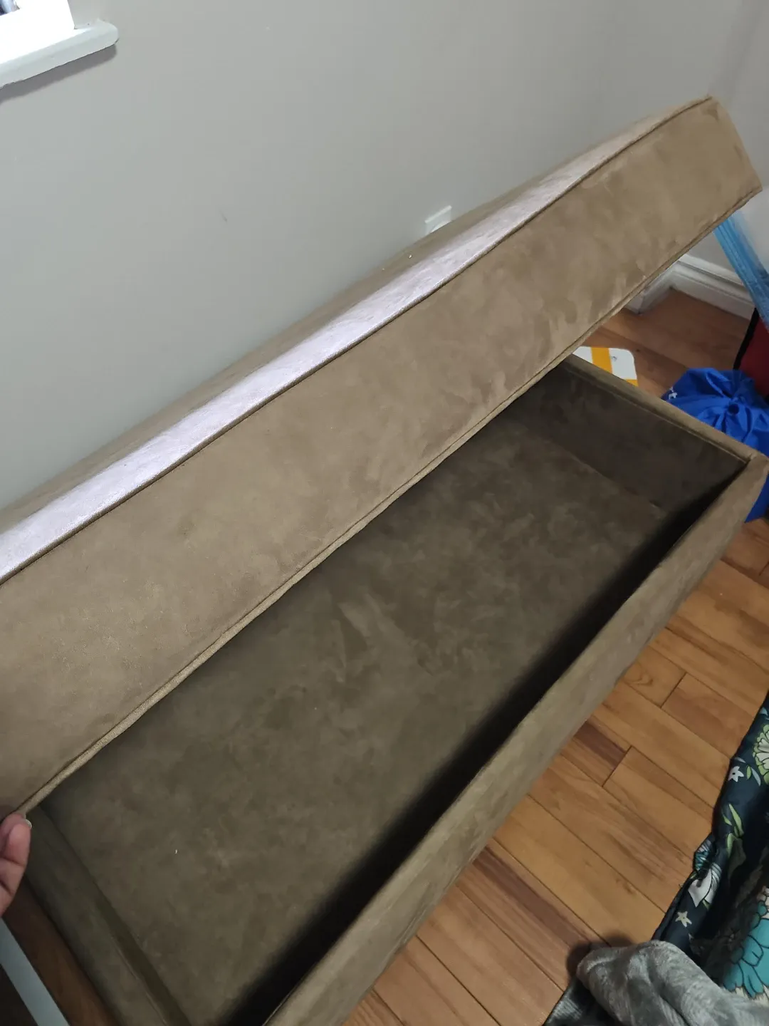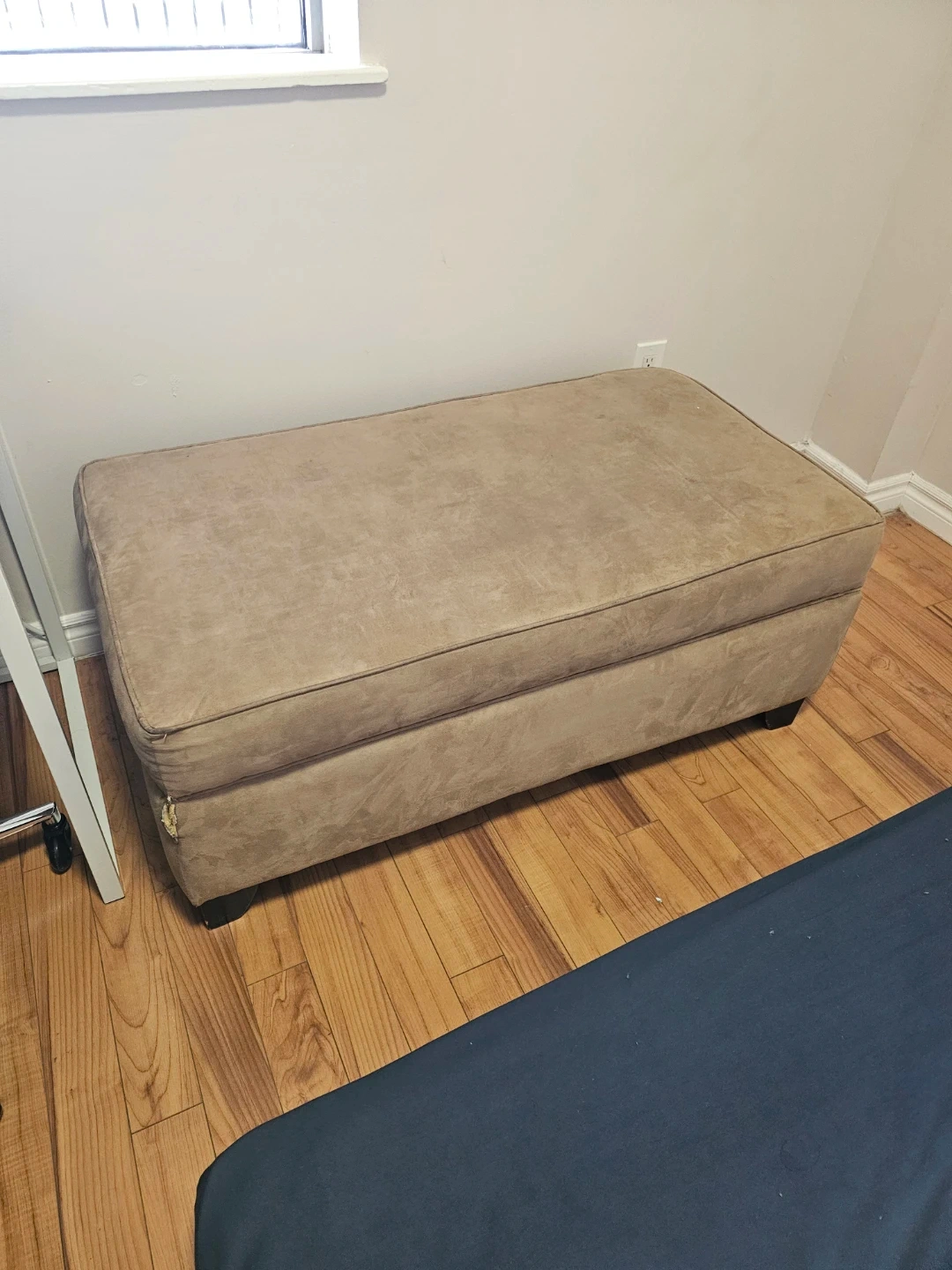 Selling a beige storage ottoman. It's in good condition and provides extra seating and storage space. Perfect for decluttering your living room or bedroom!