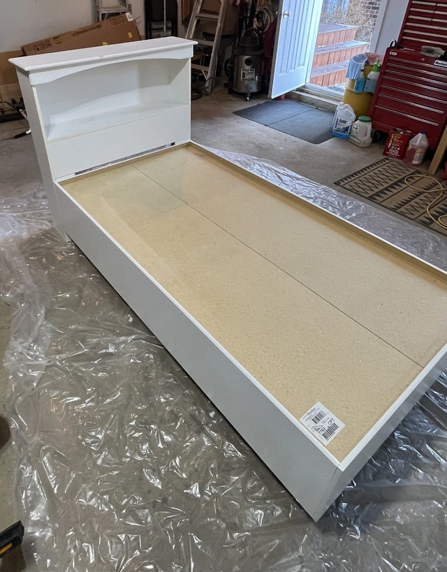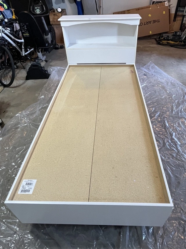 This is a used, but good condition white twin bed frame with a bookcase headboard and three storage drawers, perfect for a kid's room. The bed is sturdy and in good shape, ready to use. Mattress 2 years old included.