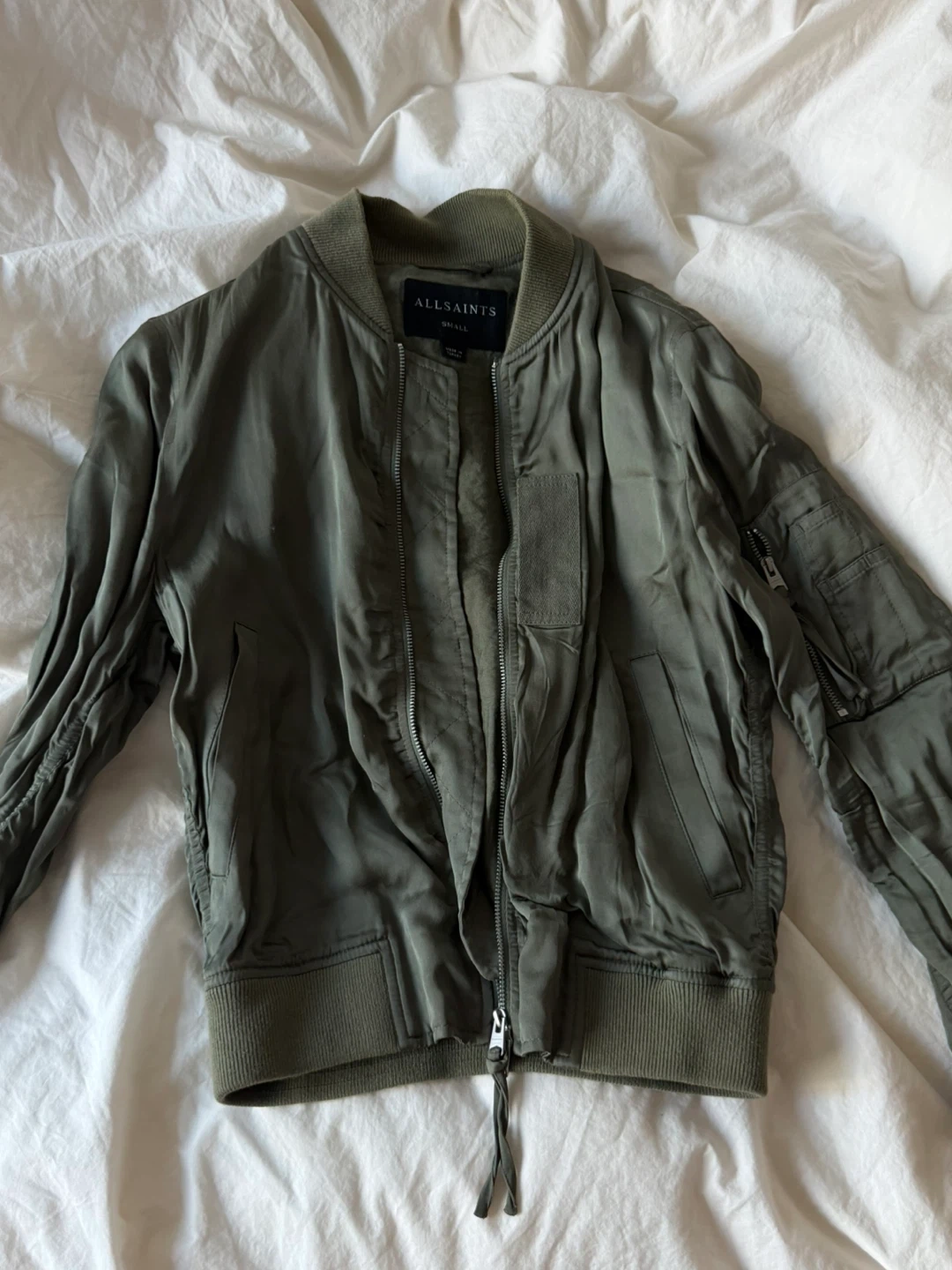 Selling an Allsaints bomber jacket in a women's size small. It's a stylish and versatile piece that can be dressed up or down. The jacket is in good condition and ready for a new owner!