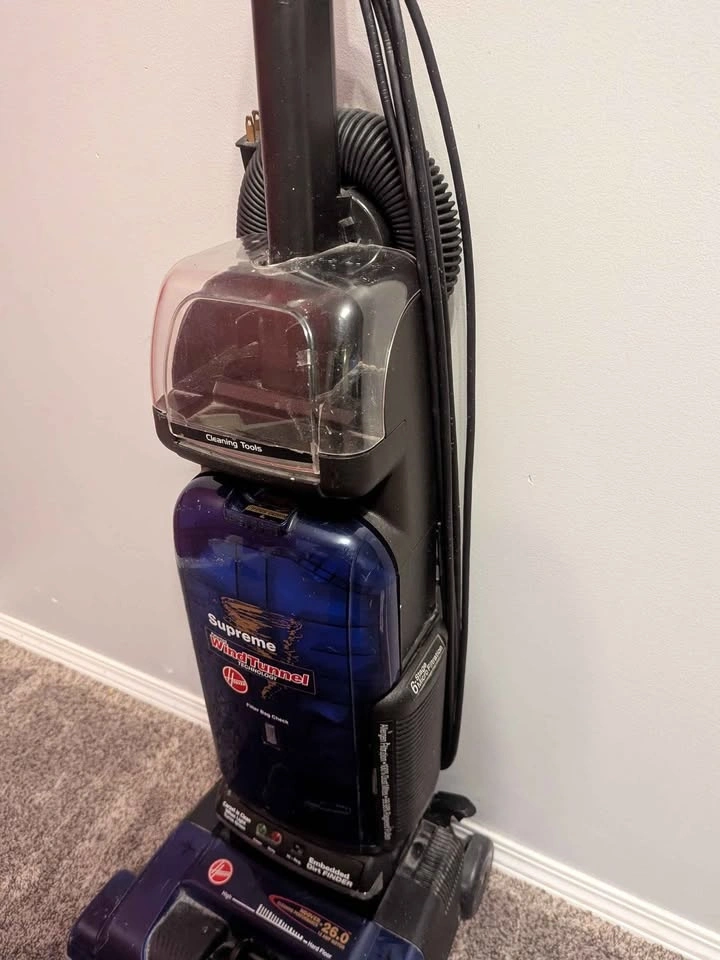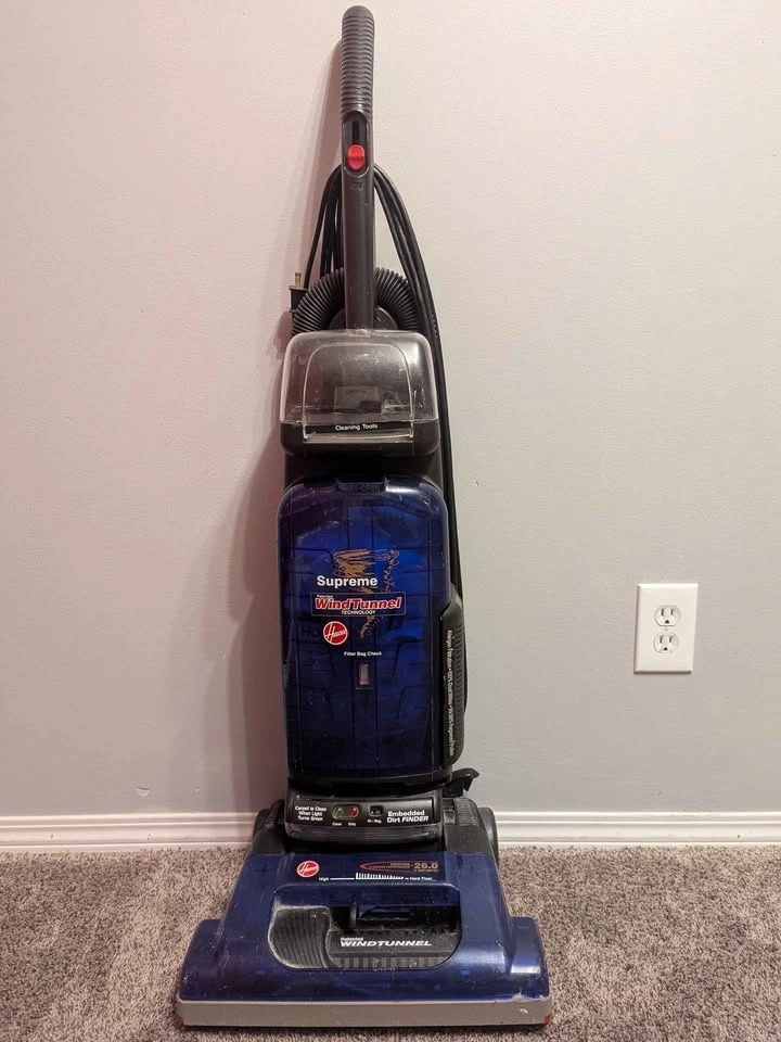Dark blue Hoover WindTunnel Supreme upright vacuum cleaner in great condition. It’s used like new, very clean, and works perfectly. I cleaned it thoroughly, including the spinning brush/motor area that collects dust and hair.