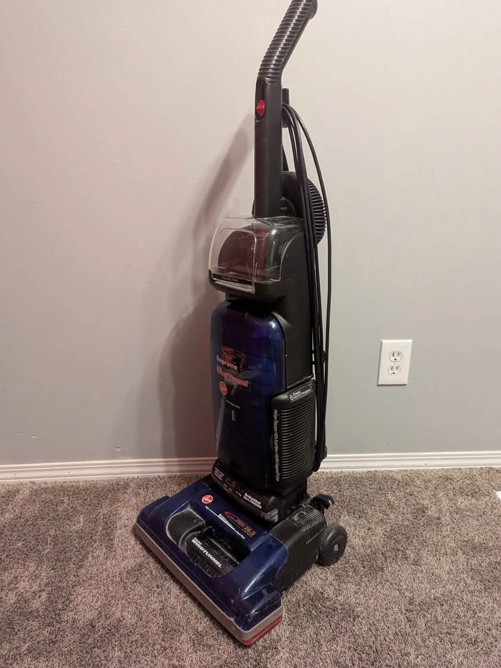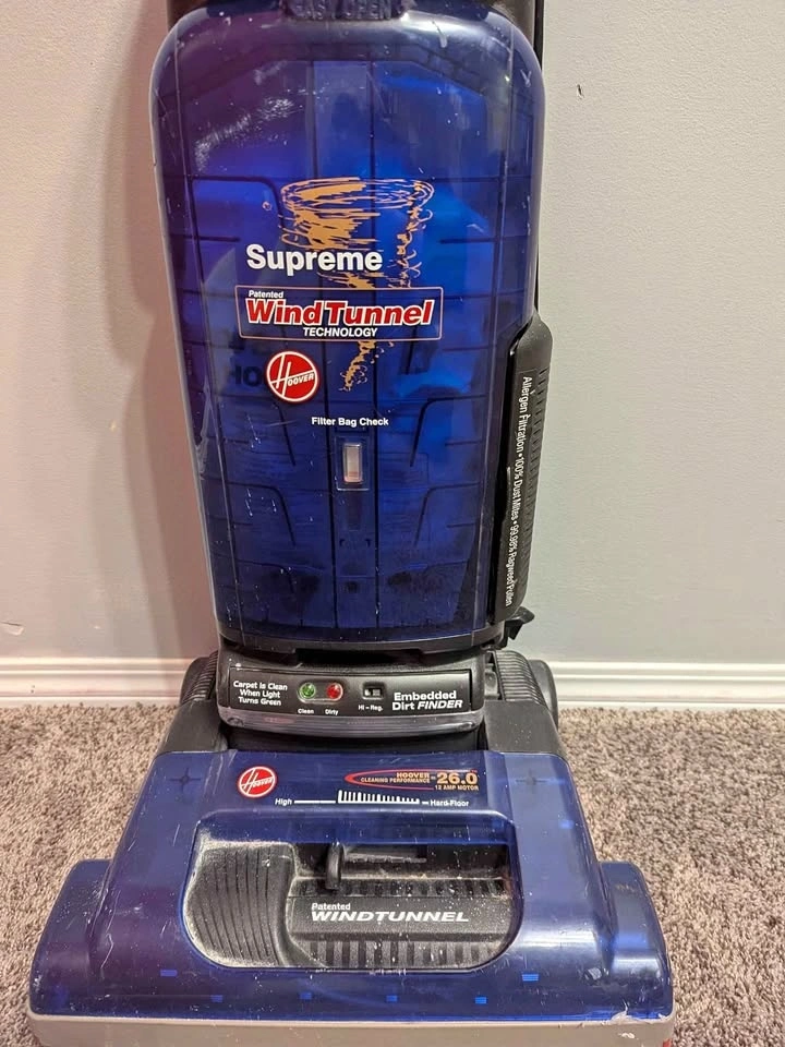 Dark blue Hoover WindTunnel Supreme upright vacuum cleaner in great condition. It’s used like new, very clean, and works perfectly. I cleaned it thoroughly, including the spinning brush/motor area that collects dust and hair.