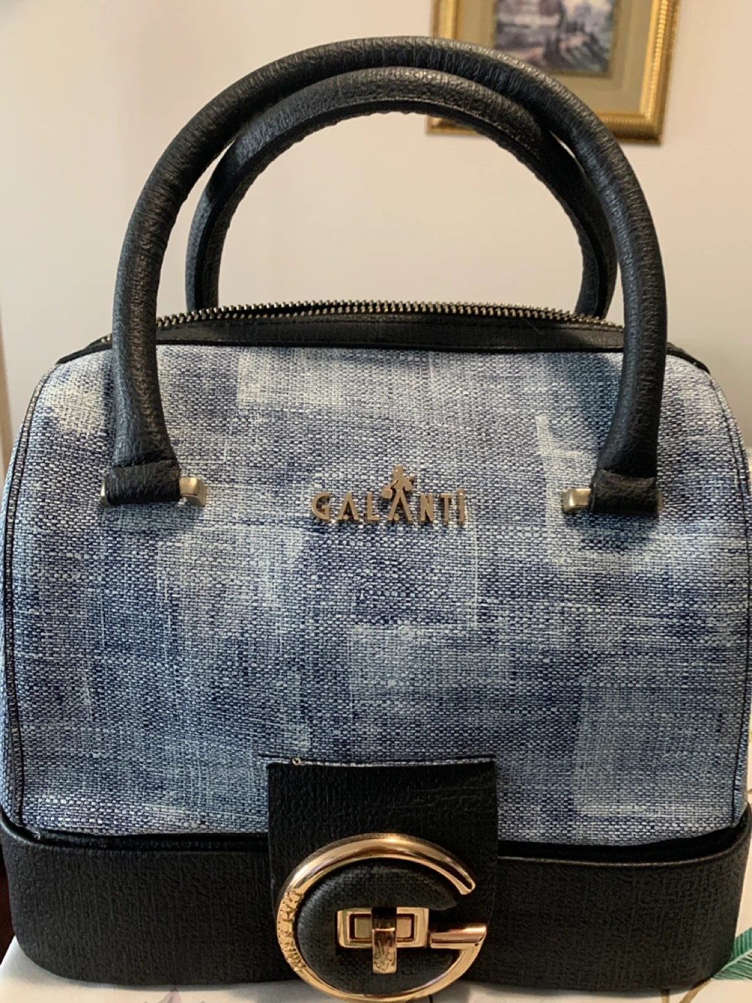 Here's a cute Galanti handbag! It features a denim-like material on the upper portion and black faux leather on the base and handles. The gold-tone hardware adds a touch of elegance to the design. It's in great condition and ready for a new owner!