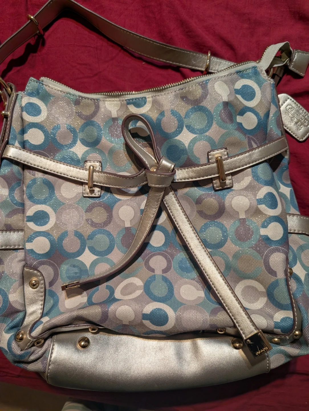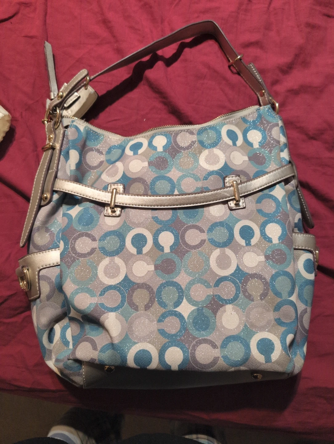 Selling a stylish Coach handbag featuring the signature 'C' print in shades of blue and grey. It's in good condition and has a silver-tone trim. Perfect for everyday use!