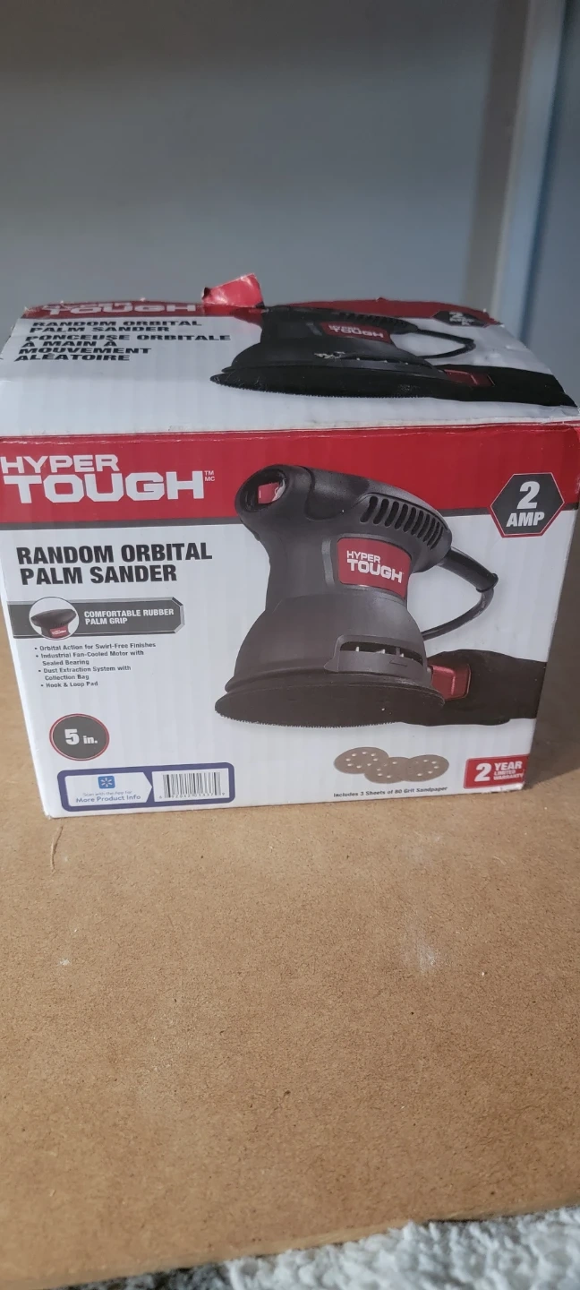 Selling a Hyper Tough random orbital palm sander! It's a 2 amp sander with a comfortable rubber palm grip. It is designed for fine finishes and has an industrial fan-cooled motor with ball bearing construction don't have sander paper