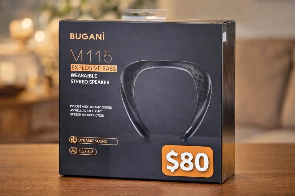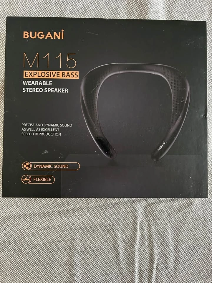 Selling a brand new BUGANI M115 wearable stereo Bluetooth speaker. The device is 100% new, never used, sealed in original packaging.