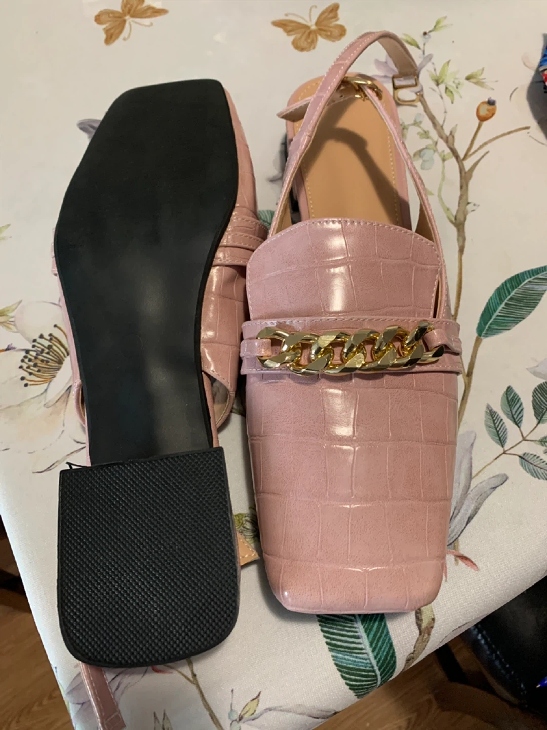 These cute pink slingback heels feature a stylish gold chain detail. Perfect for adding a touch of elegance to any outfit!