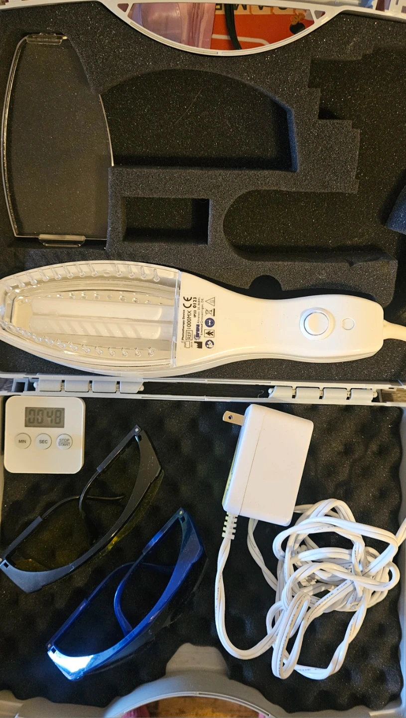 Selling a phototherapy device, model 1000MX. It comes with all the components pictured including the timer, 2 glasses and charger. It's all in the original box, ready for you to use!