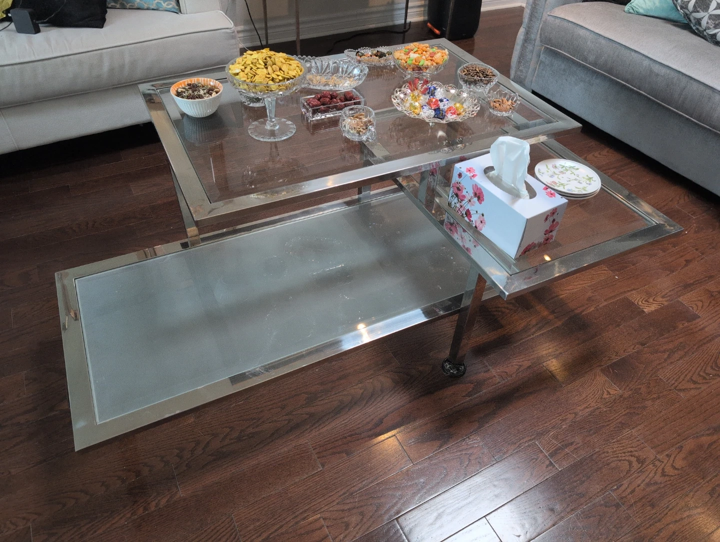 Selling a coffee table with a glass top and chrome frame. It has a modern look with three different tiers and would be a great addition to any living room. In good condition.