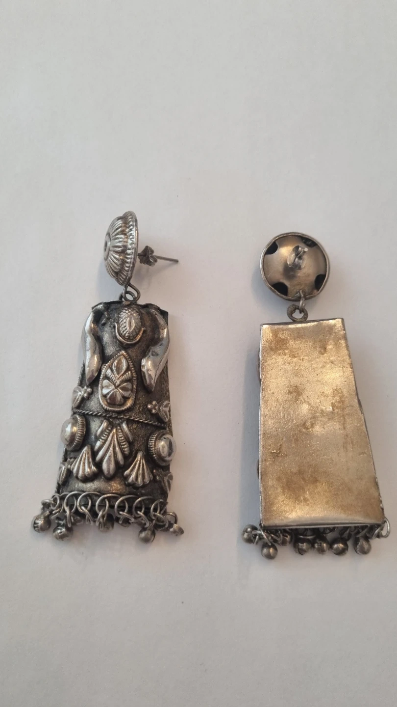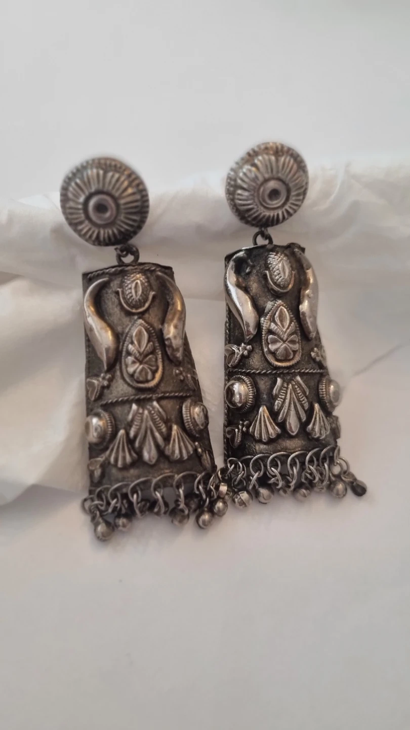 pair of vintage statement dangle earrings. They have a unique and detailed design. Perfect for adding a touch of vintage charm to any outfit!