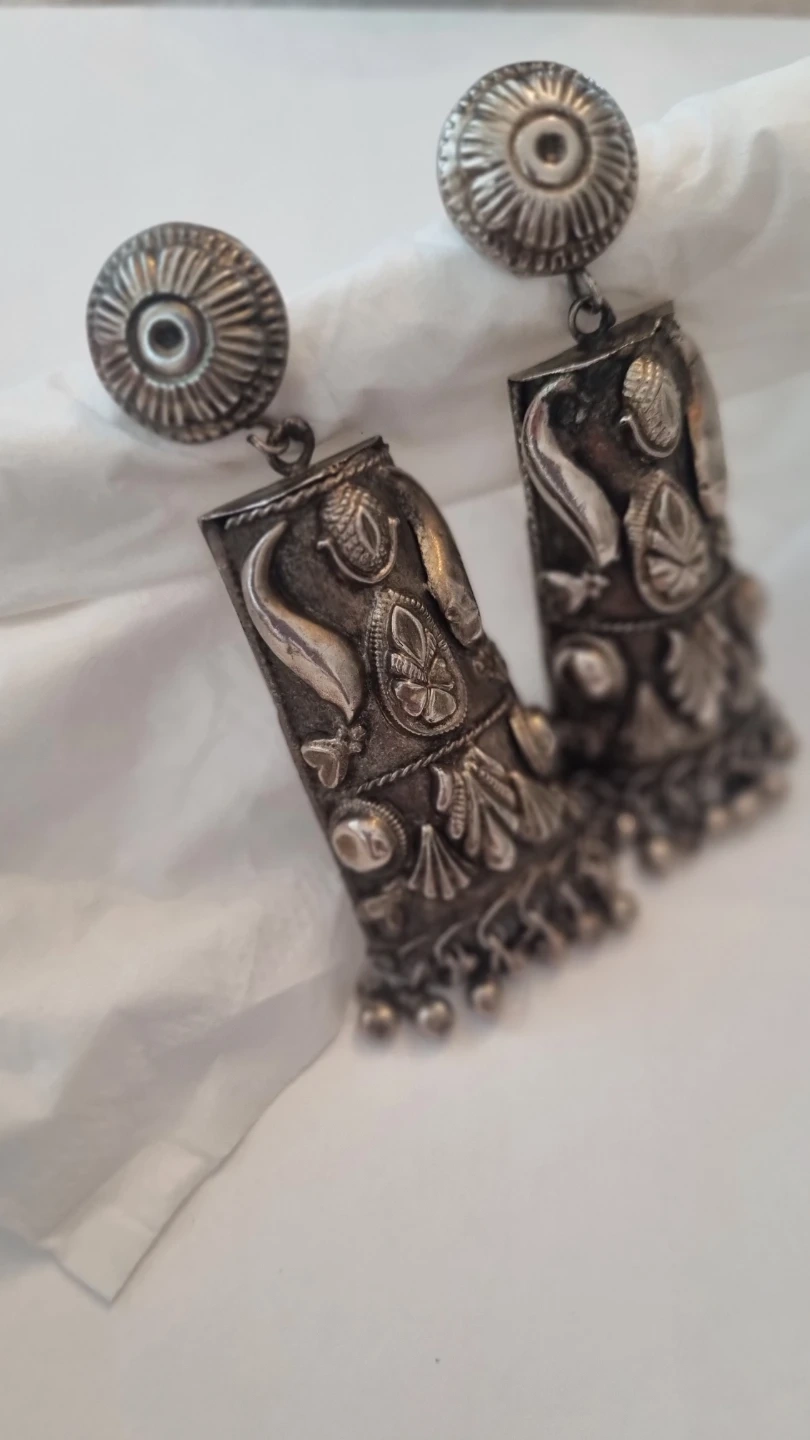 pair of vintage statement dangle earrings. They have a unique and detailed design. Perfect for adding a touch of vintage charm to any outfit!