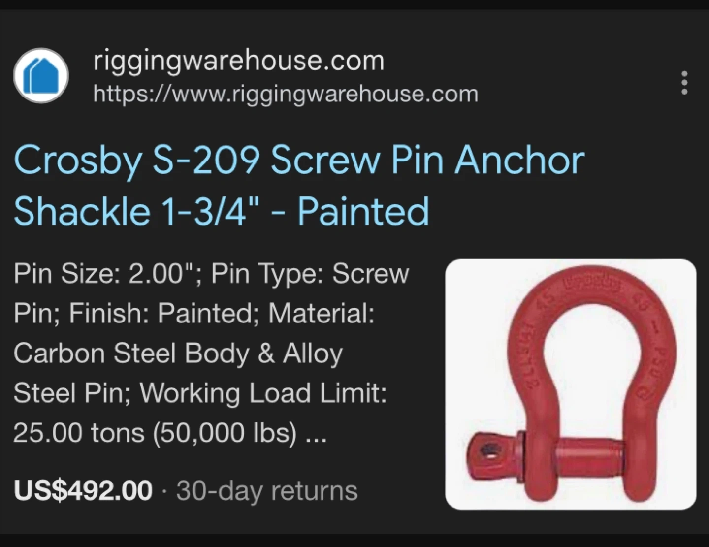 Selling a 1 3/4” and 2” Screw Pin Anchor Shackles. The shackles has a working load limit of 25 tons (50,000 lbs) and 35 tons (70,000lbs). It's made with a carbon steel body and alloy steel pin.