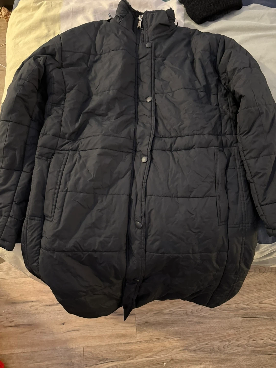 Here's a black puffer jacket in good condition. It's perfect for the colder weather. It's a stylish and warm addition to any wardrobe. Brand is Next, size is Medium with fur and lining on the inside to keep warm