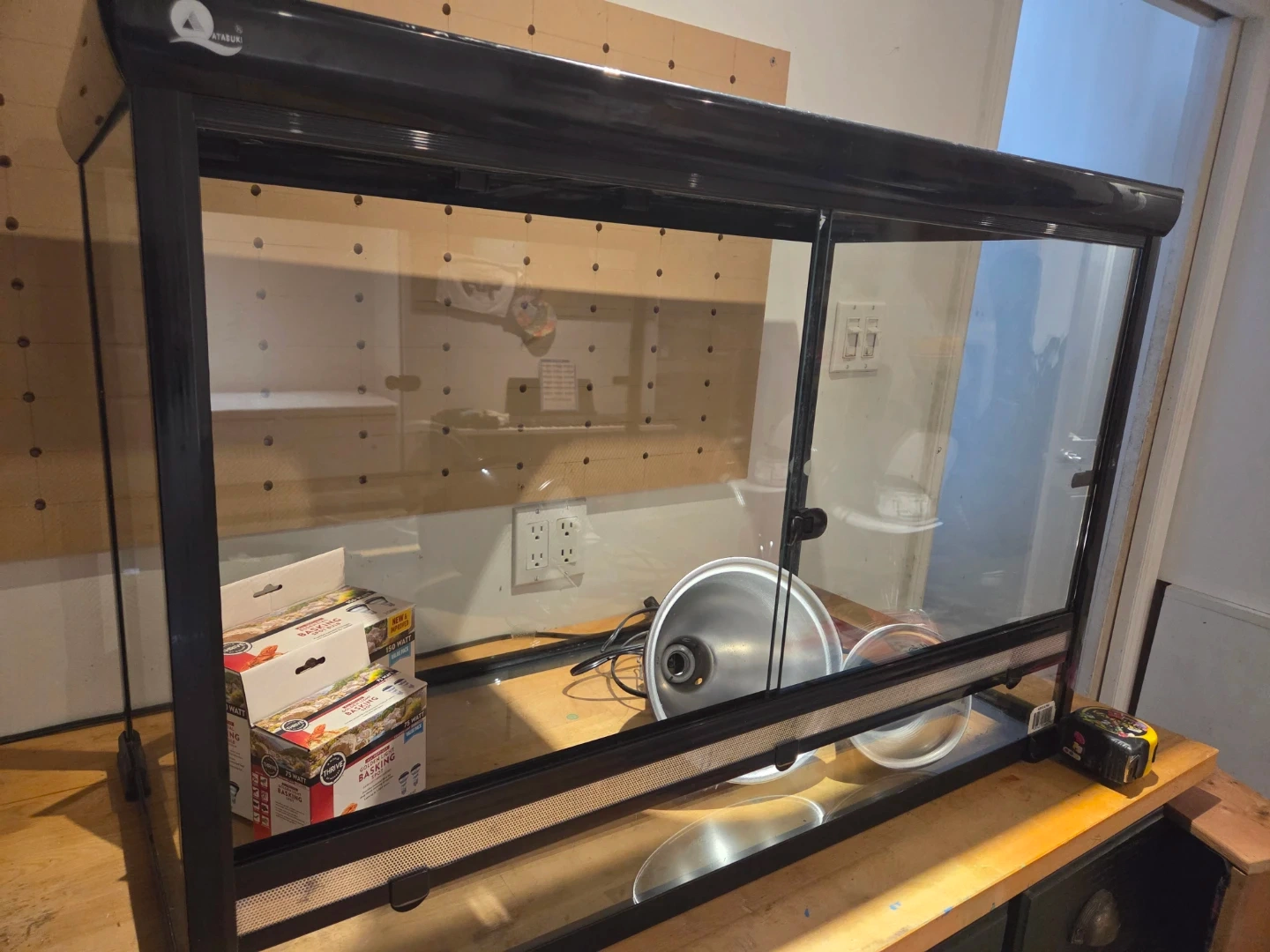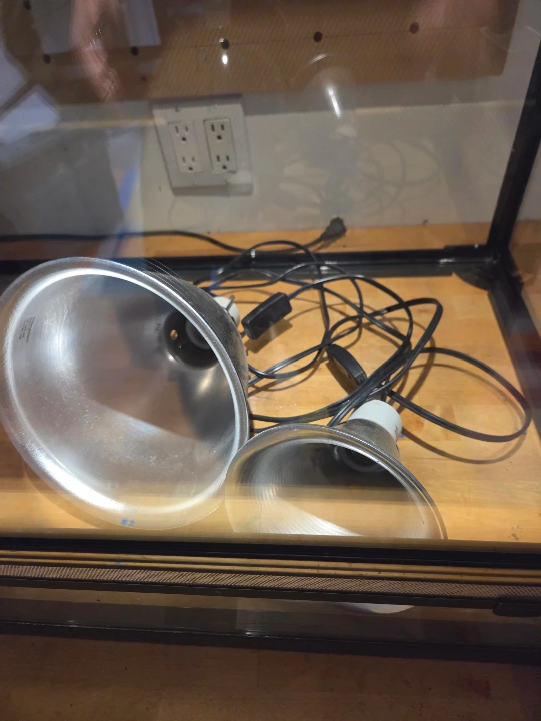 Selling a 64 gallon terrarium with basking light fixtures and bulbs (2x75w and 1x150w). Perfect for reptiles or other small animals.
