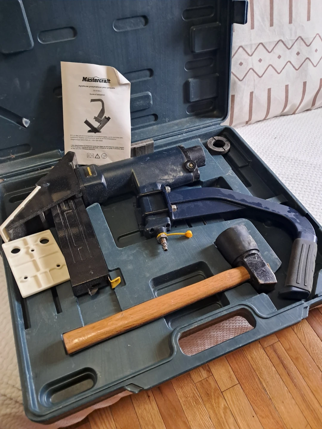 Buy & SellMastercraft Pneumatic Flooring Stapler KitMastercraft Pneumatic Flooring Stapler Kit$52Selling a Mastercraft pneumatic flooring stapler kit. It comes with the stapler, mallet, and carrying case. Perfect for installing hardwood floors!ConditionGoodWHERE TO MEET1100 Davis Drive McDonald'sView MapSELLERverifiedMichaelBogarttown761 review0 chats·1 favorites·16 viewsSEND CHAT TO SELLERHi Michael! I’m interested in your listing.Hi Michael! I’m interested in your listing.Get the Karrot app to chatSign In to chat