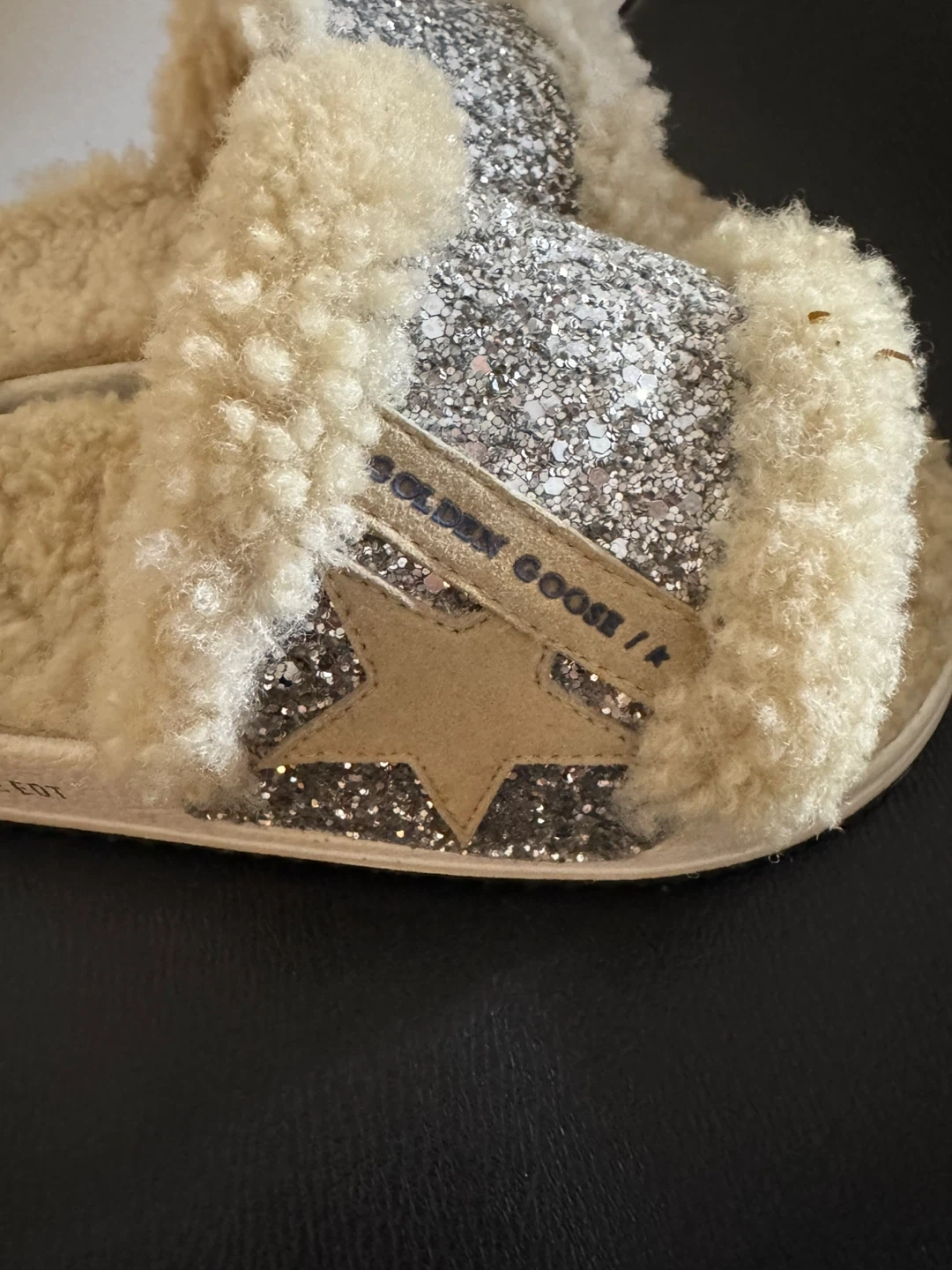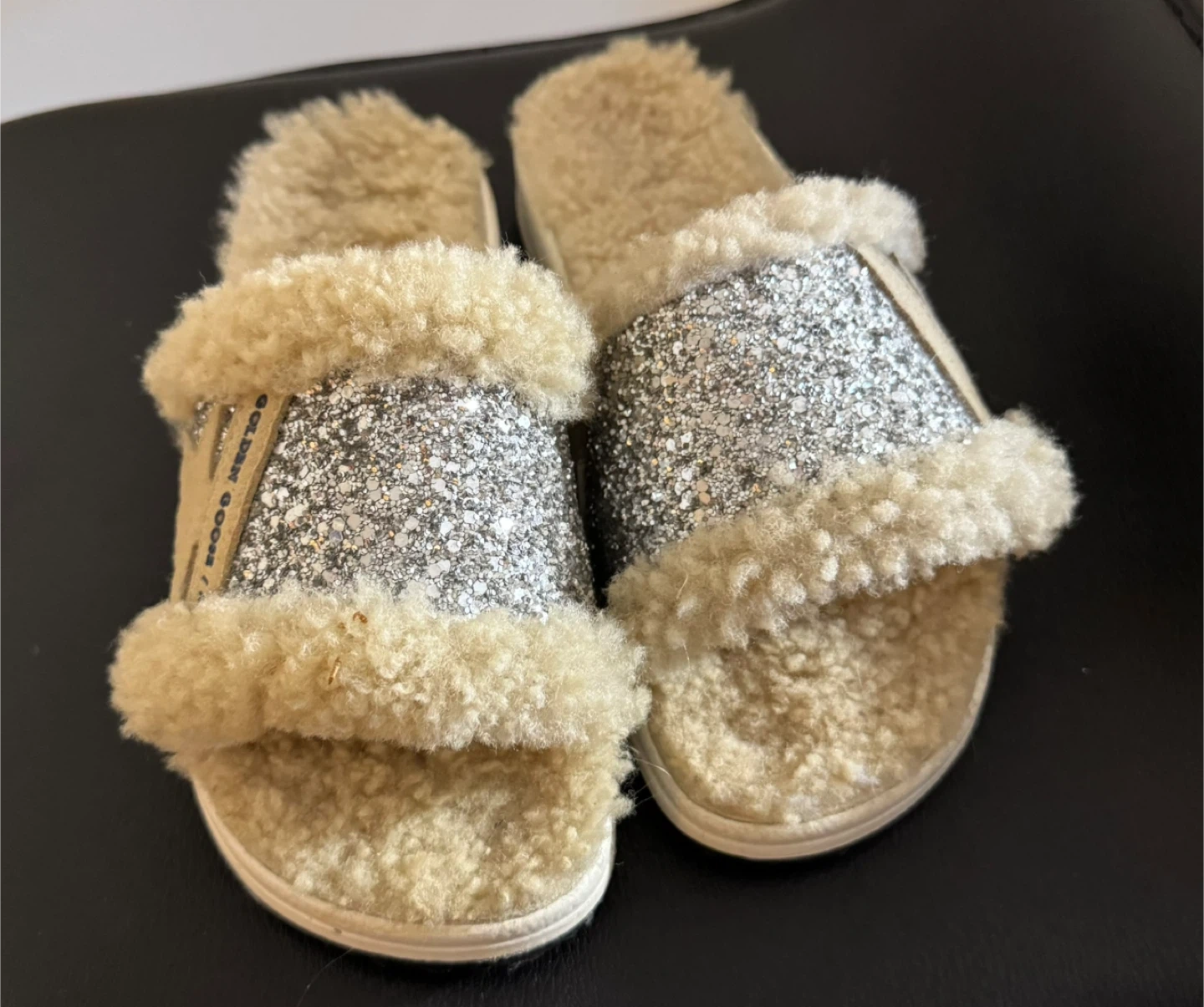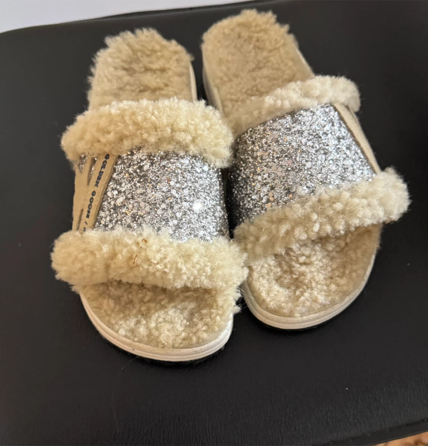 These Golden Goose slides are super cute and comfy! They feature a glittery design with a fluffy trim. Perfect for adding a touch of sparkle to your everyday look