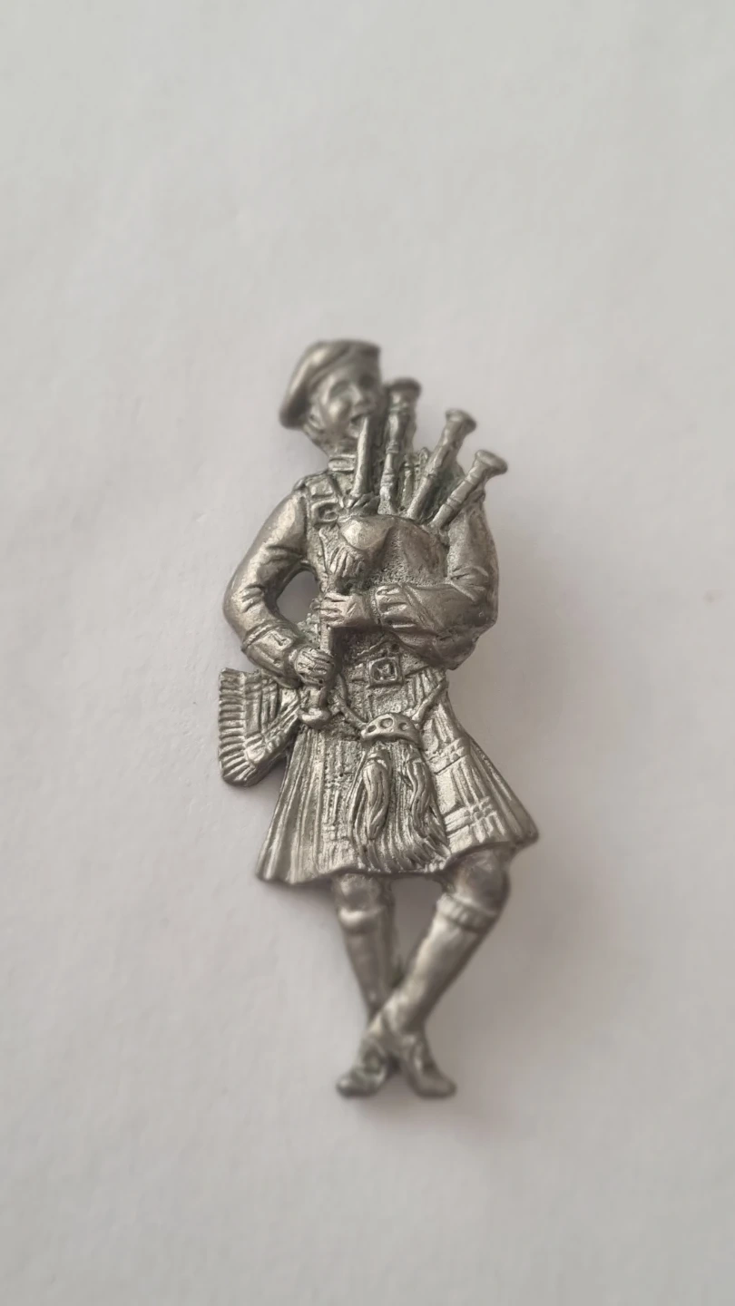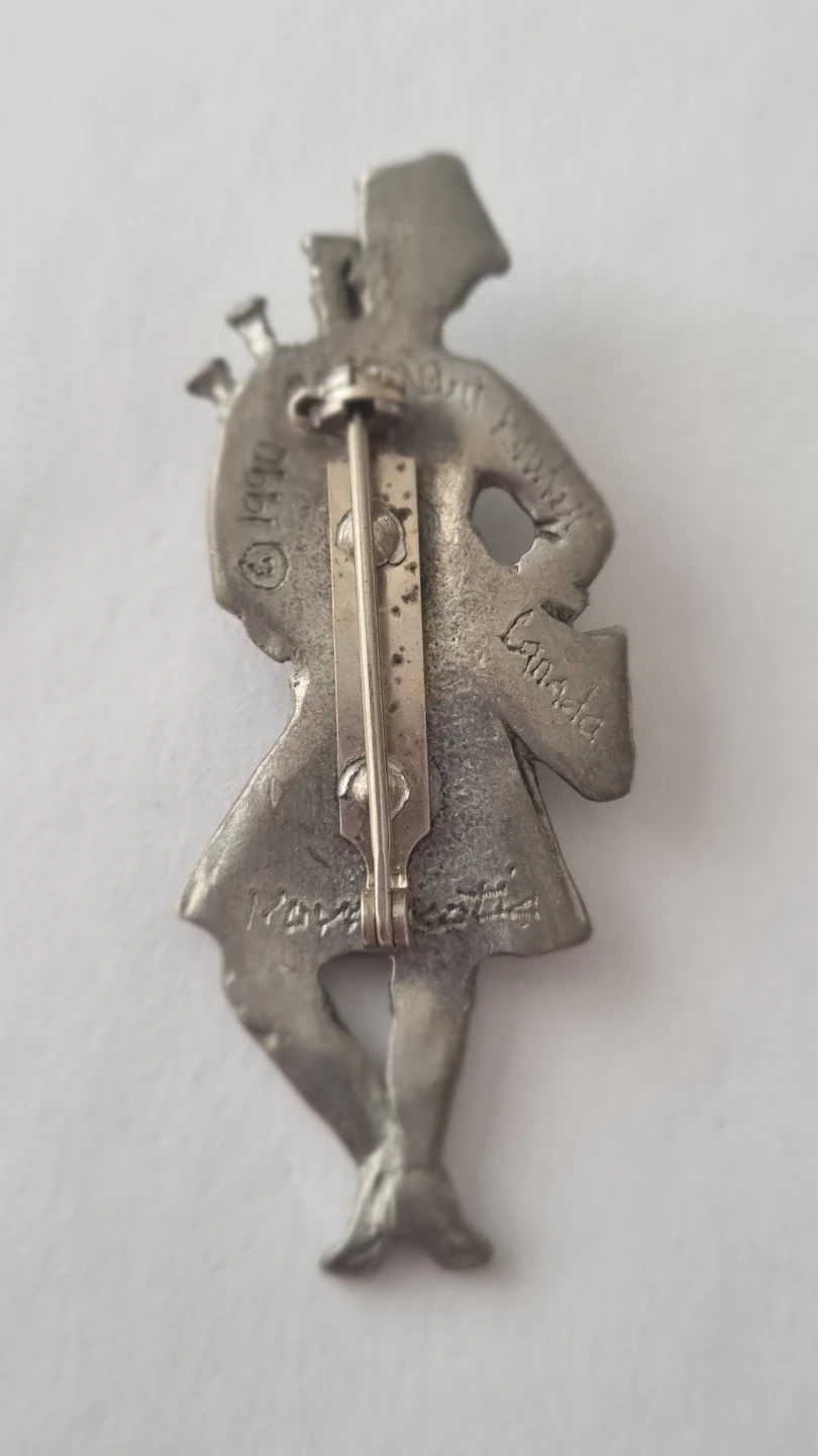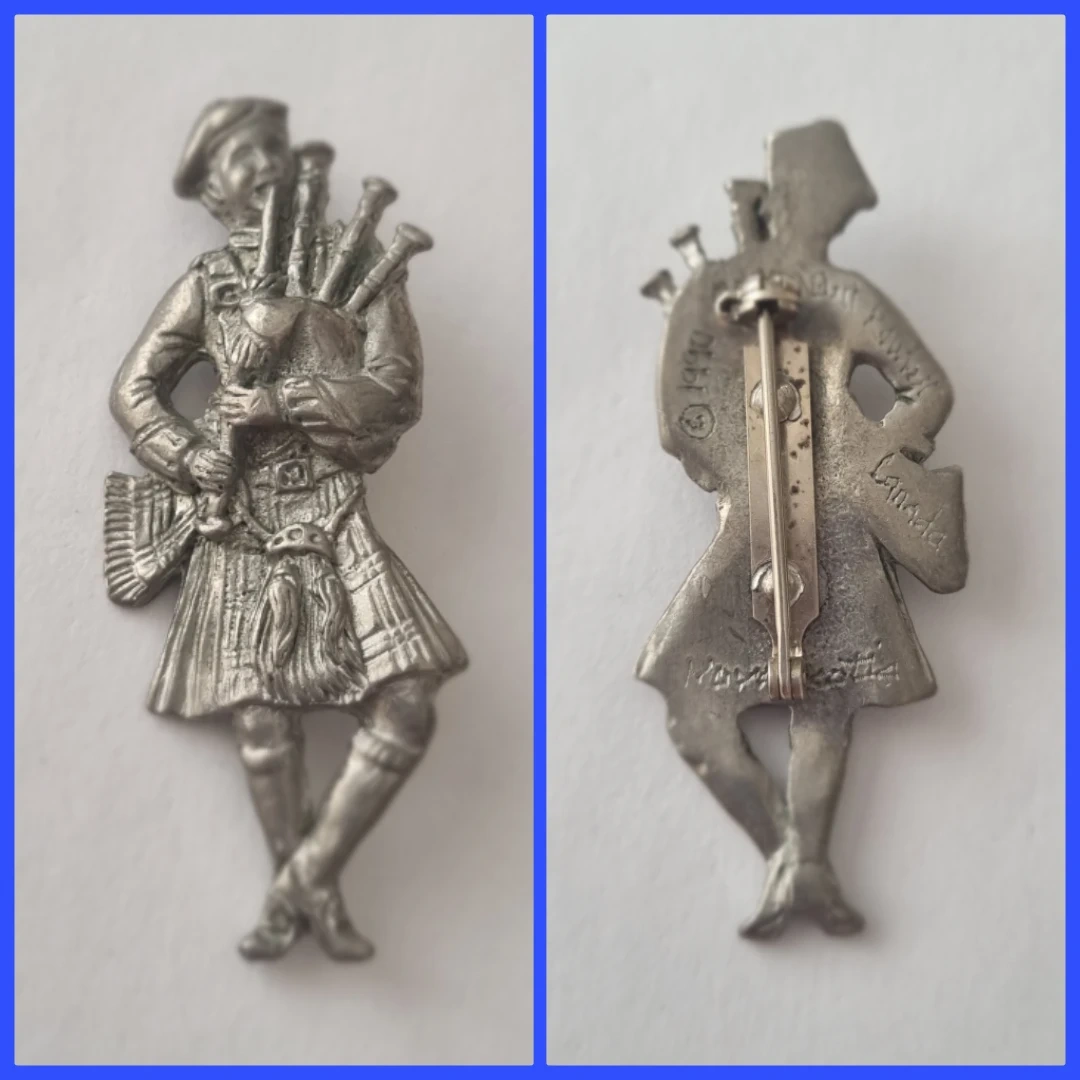 vintage brooch featuring a Scottish bagpiper. It's marked '1990' and 'Canada' on the back. A lovely piece for any collector!