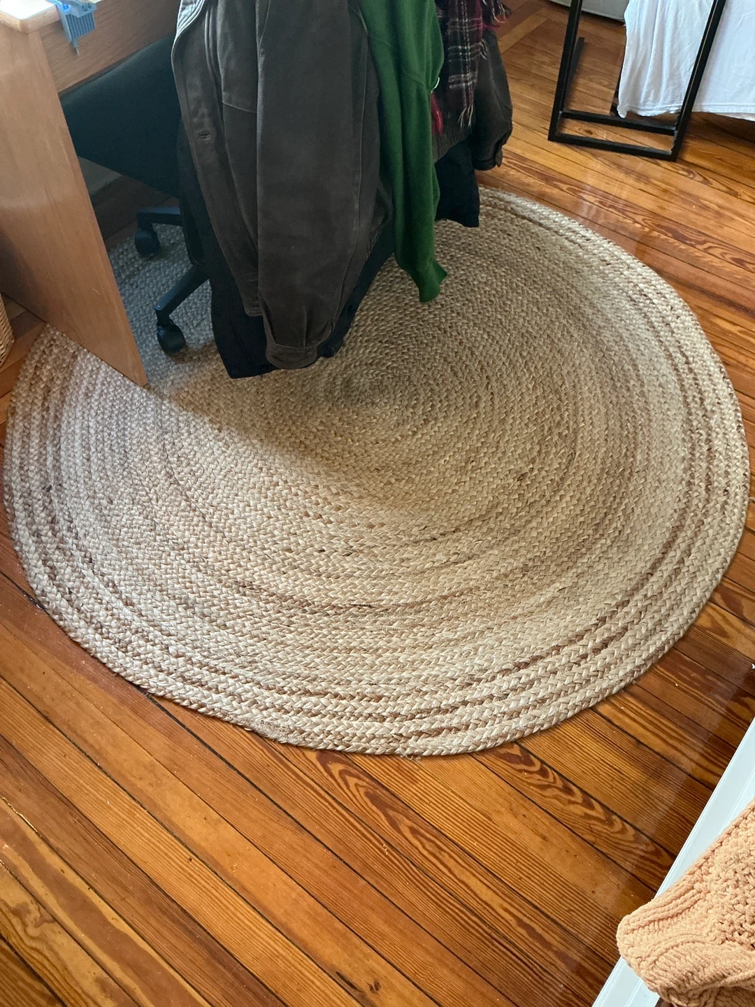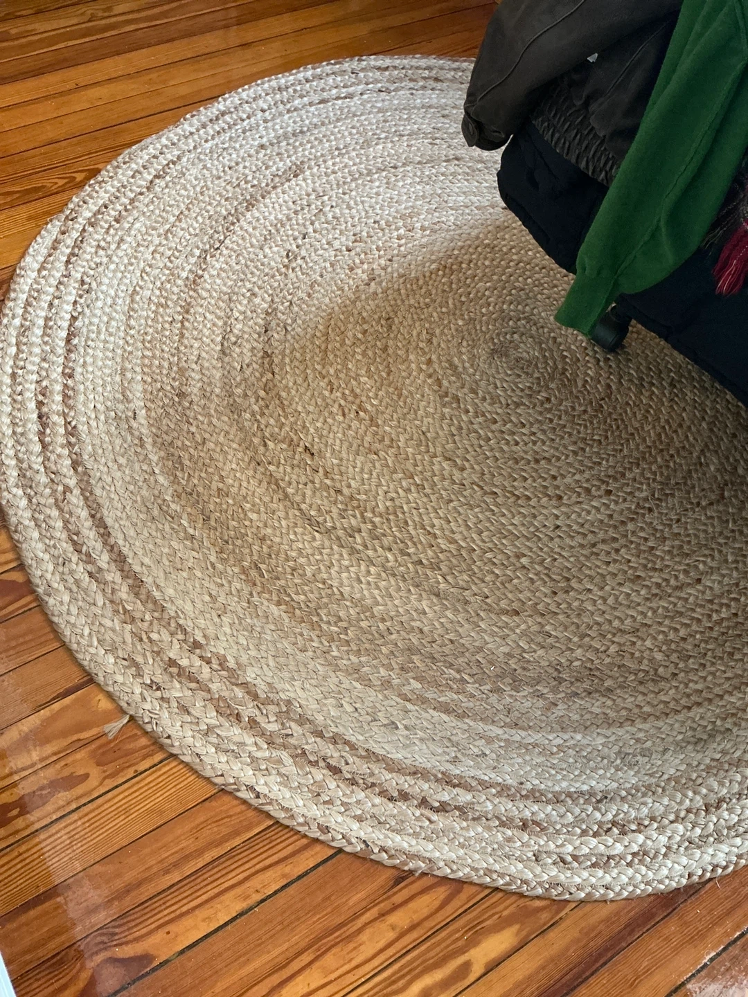 Selling a round jute rug! It's in good condition and would look great in any room. The rug is made of natural jute material.