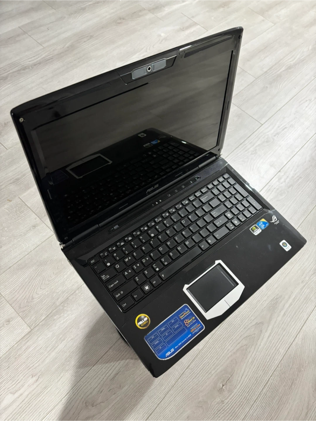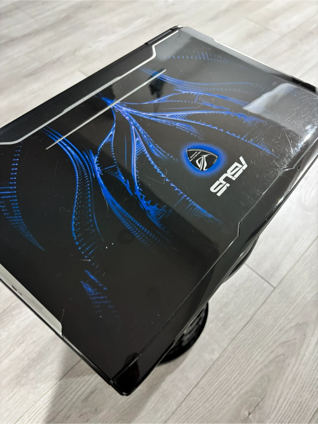 Selling an Asus retro gaming laptop in black. It has a cool blue design on the top. It's in good condition and ready for a new owner!
