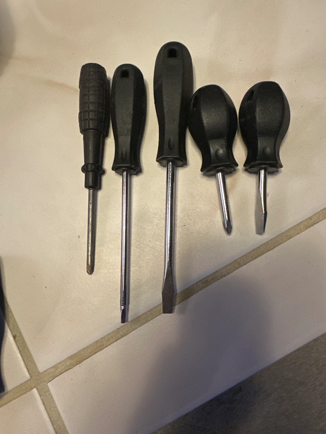 Selling a set of screwdrivers. They have black handles and come in various sizes and head types. Great for small tasks around the house!
