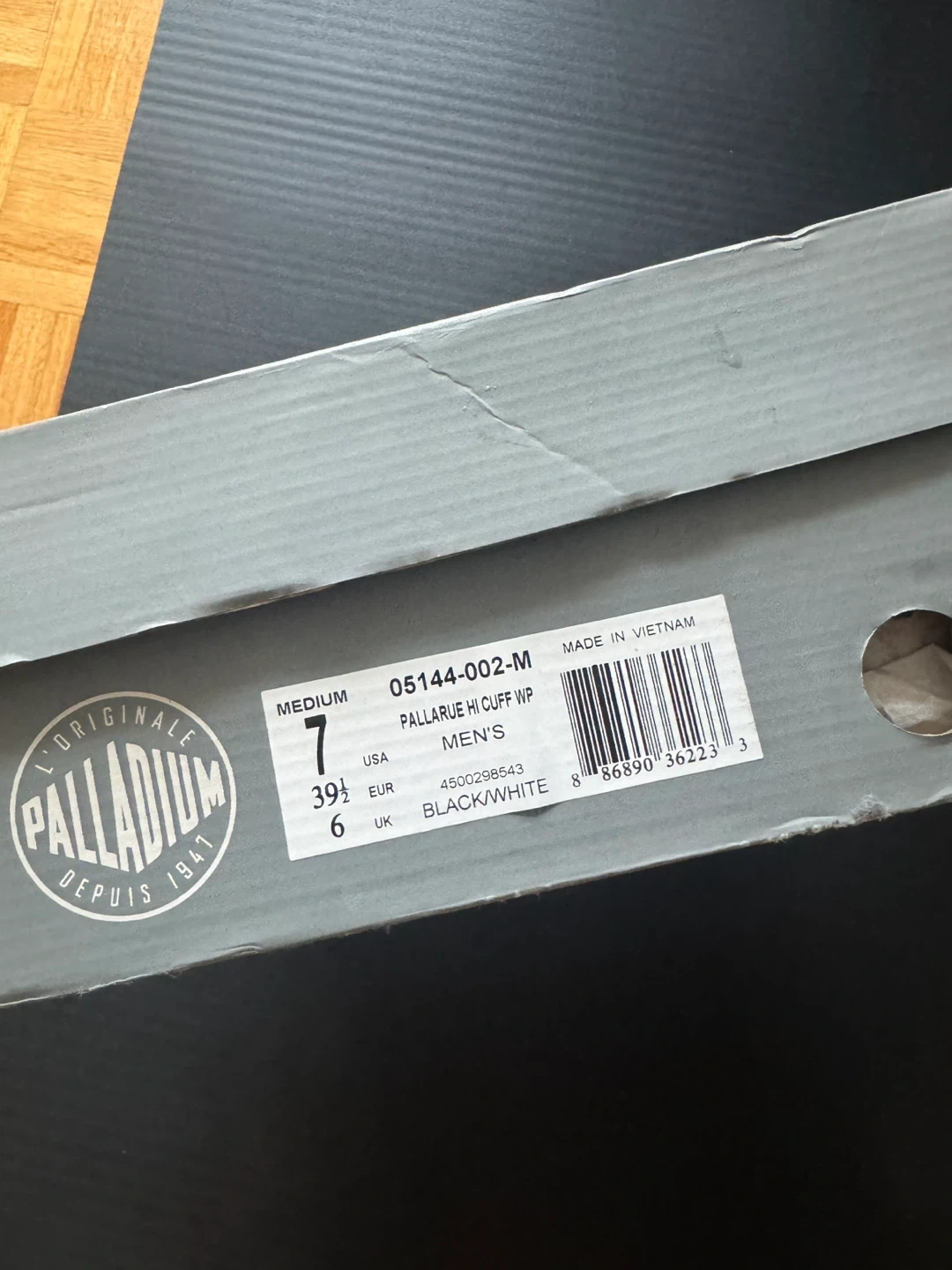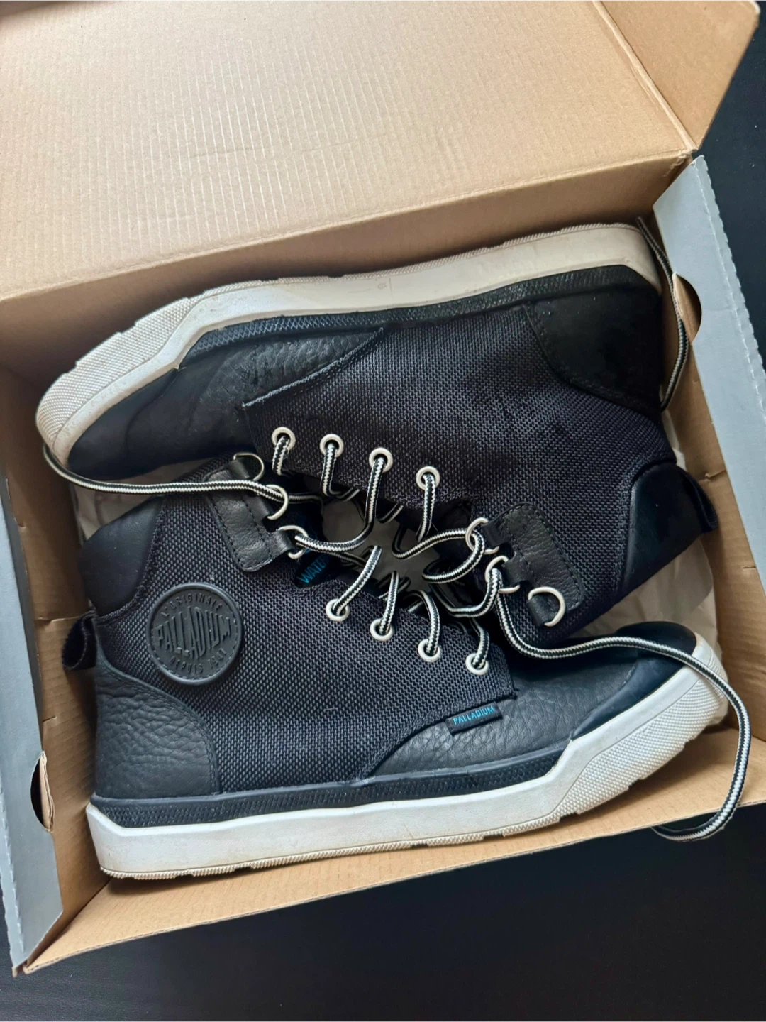 Selling a pair of Palladium Hi Cuff WP men's boots in black and white, size 7. They are in great condition and come with the original box!